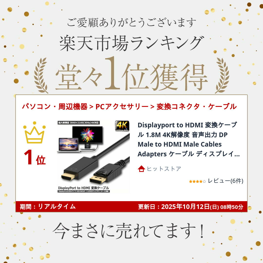 ケーブルの長さは1.8Mになります。【DisplayPort HDMI変換】 ケーブルは、DisplayPortを搭載したパソコンをHDMIポートを持つディスプレイ・テレビに接続するときに使用する変換ケーブルです。【dp hdmi 変換 ディスプレイポート】4K@60Hzまで ,4Kだけでなく、2K/1080pのディスプレイとも下位互換性があります。3Dに対応するマルチ・アプリケーションをサポートし、さらに高いリフレッシュレートで、画面のティアリングやフレームレートの不安定さを排除、破綻のない滑らかな画面を実現します。【幅広い互換性】デスクトップPC(グラフィックス:NVIDIA / AMD)、ラップトップ(HP / Lenovo / Dell)などのDisplayPort付き機器に対応しています。映像・音声同期出力、ミラーリング・拡張モード・マルチディスプレイ対応します。【dp to hdm】安定・長持ち 劣化に強い24K金メッキコネクター、及び多重シールド処理を施すことにより、信号ロス・ノイズを最低限まで抑え、 映像・音声を遅延なく転送。また、高品質のスマートチップ・発熱防止のアルミ合金コネクタなど採用、一体成型術で断線しにくい構造にし、長持ちさせます■驚きの4K画質 ・4K @30hz Ultra HD 2160p(3840×2160)、 4K @60hzには非対応なのでご注意ください。・2K Quad HD 1440p(2560×1440)、30hz -60hz・2KフルHD 1080P(1920×1080)、30hz -60hz・1K HD 720P(1280 * 720)、30hz -60hz・3D・HDR■DP を変換アダプタなしで簡単に接続!すっきり配線!DisplayPortからの信号を、HDMI入力端子を持つディスプレイやプロジェクターなどに出力することができます。・HDMI出力からDisplayPortへの変換はできません。・USBポートには対応していません。■デジタル音声出力対応HDMI/DisplayPortのデジタル音声出力に対応しています。■大画面で共有できる拡張・複製モードを搭載、画面の液晶テレビやディスプレイ、HDMI端子しか搭載していない機器との接続に便利です。■対応機種DisplayPort端子搭載のPC及びHDMI端子搭載のモニター等、例えばHDTV、モニター、プロジェクター、デスクトップ、AMD、NVIDIA、HP Elitebook、ThinkPad ご注意:1. DisplayPortからHDMIまで伝送出来ます。両方でも伝送ではありませんので、ご注意ください。2. DisplayPortのコネクタのリリースボタンを押したら、ケーブルを取り外します。3. 無理な力を掛けてのご利用や、ケーブル根元付近などに極端な曲がりを与えないでください。4. お使いの機器のコネクタ形状と合っているかご確認の上、ご購入ご使用ください。5. 本製品は屋内用ですので屋外ではご使用にならないでください。6. 本製品を分解したり、加工しないでください。