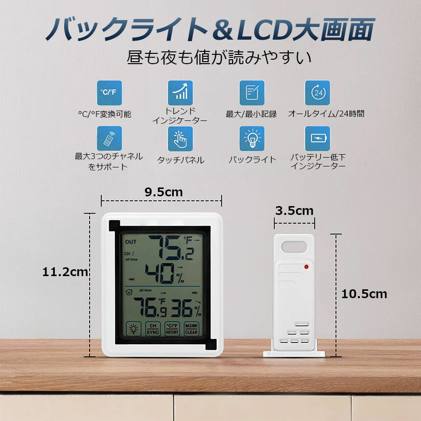 【タッチバックライト付き】デジタル温度計はバックライト機能があるから、薄暗い所でも設定と読むのは便利になります。【最高最低温湿度の表示】室内外温湿度計は現在の室温と湿度が見やすく表示され、最高の温度、最低の温度と湿度を覚える機能、温度湿度のトレンドの指示、快適度の指示。【室内外温湿度】最大3台の子機を接続することができます、子機はハンガーホールに吊るすことができますし、水平面に立つこともできます。XP3級耐水。室内温度湿度計は卓上スタンド・マグネット・壁掛け用フック穴が付いているので、自宅の様々な場所に設置出来ます。【おんしつどけいの測定範囲】:本体表示温度範囲(-20 °C ~ 70 °C)、表示湿度範囲(20% ~ 95% RH)。子機精度表示温度範囲(-40 ~ 70 °C)、表示湿度範囲(20% ~ 95% RH) °C。 精度(湿度): 20〜95%(±5%)。 精度(温度):-40 °C ~ 70 °C(±1%) 本体サイズ:高さ11.2cm×幅9.5cm×奥行2.4cm。素材・材質:ABS(アクリロニトリル・ブタジエン・スチレン)樹脂※注意事項※・製造ロットにより、予告なく外観・色に変更がある場合がございます。・本商品は、電波法令で定められている技術基準に適合していることを証明する技適マークが貼付されていない無線機器であり、日本国内で使用する場合は、電波法違反になる恐れがございます。・ご使用の際には、十分ご注意下さいますようお願いいたします。・詳しくは最寄りの総務省総合通信局へお問い合わせ下さい。