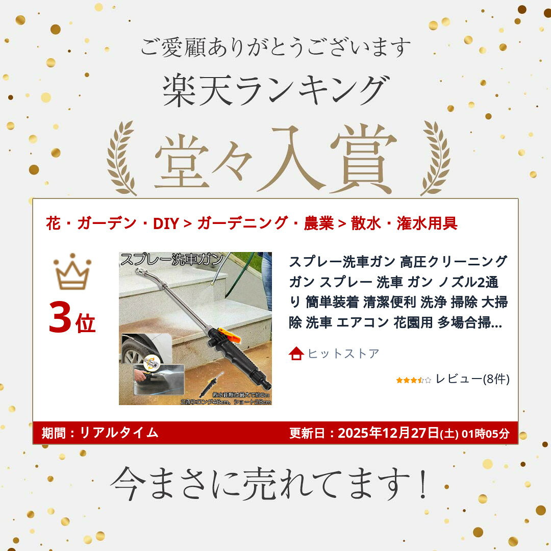 ・高圧洗浄可能な散水ノズルです、水道の蛇口ホースに装着するだけ。車、エアコン、バイク、自転車、家の壁面などの清掃時、協力な水圧で汚れを落とします・ノズル先端部にて、水の角度の調整が可能。一点集中型清掃のジェット水流はもちろん、広範囲清掃用の霧状スプレーへも変換可能。ガーデニングや農作業での散水や肥料の散布等にも活躍します・ハンドルはすべり止めのグリップ付きで握りやすく、スイッチはロック機能付きで、長時間の作業も疲れにくい設計です。ステンレス製のノズルは、錆びにくく、長期間ご愛用いただけます・サイズ:2通り:ロング48cm ショート28cm、スプレー使用距離が長く、上限6m。