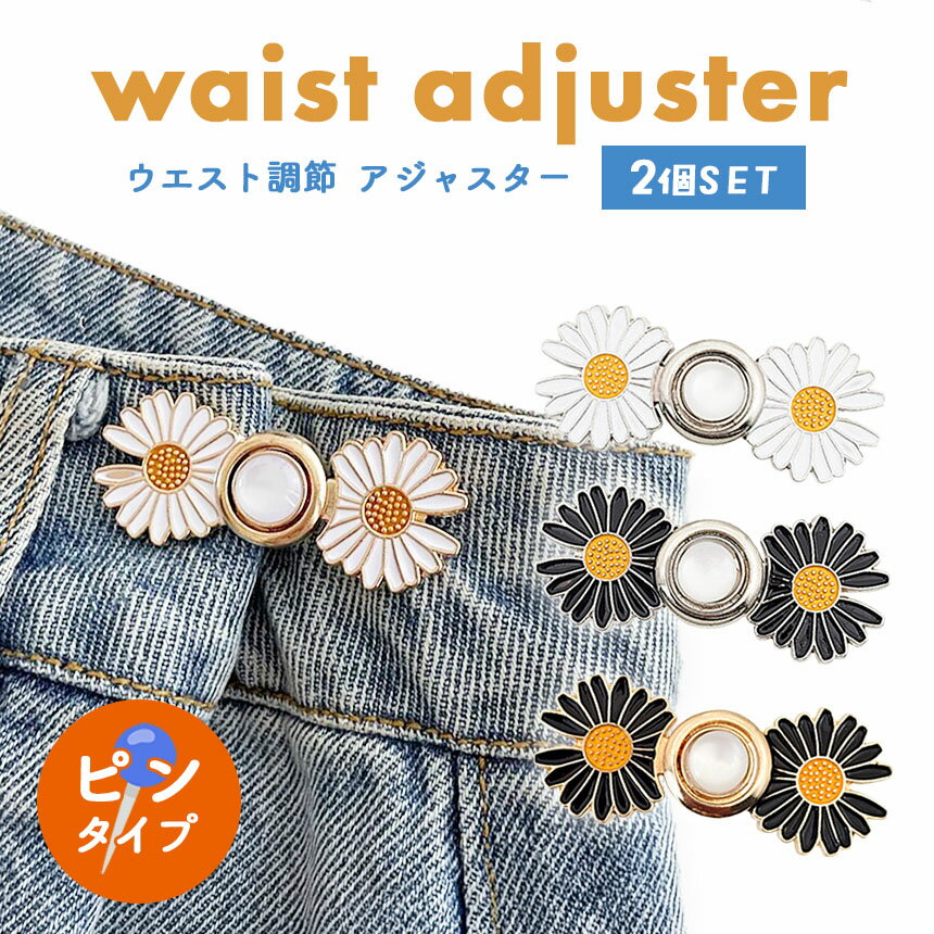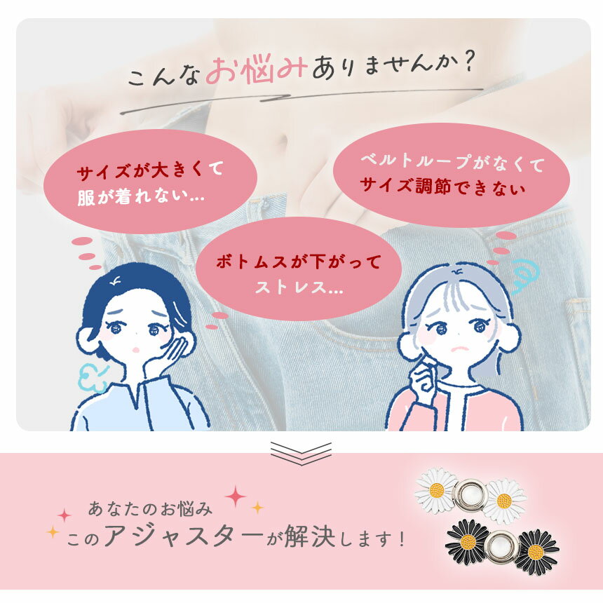 ※こちらはピンタイプの商品になります※●ピンタイプ ウエスト調節アジャスター 2組セット●こんなお悩みはありませんか?・ウエストサイズが大きくて お気に入りの服が着れない...。・腰の位置がすぐにズしてストレス...。・ベルトループがなくて サイズ調節できない...。あなたのお悩みをこのウエスト調節アジャスターが解決します!point【簡単にウエストが調節できて細見え】穴に通して固定するだけで簡単にウエストを調節!また針タイプなので簡単に何度でも位置を変更◎デニムやスラックス、スカートなどにも取り付けることが出来ます。point【簡単な取付方法】必要なものは何もありません。簡単に取り付けることが出来ます。1.キャップ後部の円形パーツを引っ張りながら回して取ります。2.位置を確認し、取付けたい場所に針を刺します。3.キャップを戻します。4.もう片方も同様に取付けたら、完了です。※手が傷つかないよう十分にご注意ください。point【シンプルで可愛いデザイン】お花の形が可愛いアジャスターです。どんなファッションにも合わせることが出来ます。【セット内容】※2組セットの商品になります。Aセット:白花 シルバー/ ゴールド 各1個ずつBセット:黒花 シルバー/ ゴールド 各1個ずつ【サイズ】縦1.8×横4.5cm縦1.8×横3cm / 縦1.8×横2.8cm(外した時)【重量】約7g※日本語取扱説明書、撮影用小物類などは付属しておりません。※簡易包装でのお届けとなります。※モニターにより色合いが若干違いが生じる場合がございます。※デザインは入荷時期により若干変化する場合がございます※海外製造品のため、多少の匂い軽微な傷や汚れ、個体差等ある場合がございます。※商品の使用により生じた如何なる損害・被害も弊社では一切の責任を負いかねますので予めご了承ください。※発送方法について:お届け先、個数によって配送情報に記載の配送業者とは異なる場合がございます。日本郵便、佐川急便、またはセイノーエクスプレス(大型商品)でお届けいたします。なお、配送業者はお選びいただけませんので、ご了承ください。