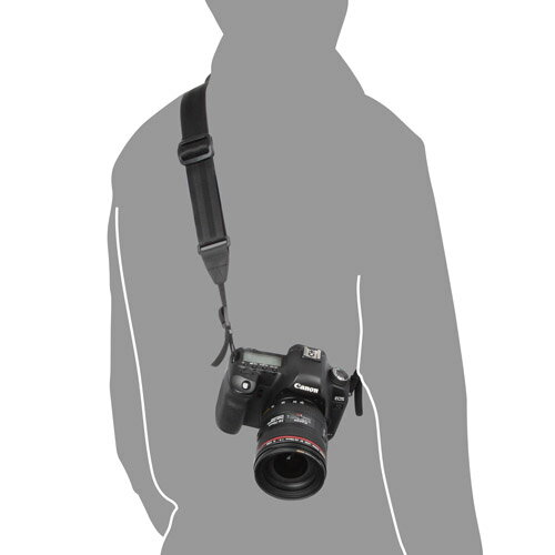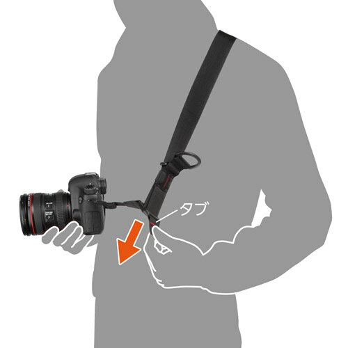 素早く長さ調整が可能なショルダーストラップ【商品仕様】全長:約1150〜1600mmストラップ部長さ:約650〜1100mmストラップ部幅:38mm先ヒモ幅:10mm重量:約85g材質:ナイロン、PU簡単な操作で素早く伸ばしたり縮めたりできるショルダーストラップです。瞬時に伸ばして撮影に移行できるのでシャッターチャンスを逃しません。縮めると身体に密着しカメラ携行時の揺れを抑えます。一眼レフカメラに最適なストラップ幅38mmタイプです。 身体にフィットして揺れを軽減 ストラップを縮めると身体にフィットしカメラの揺れを抑えて携行できるので、肩への負担が減ります。カメラを背中側に回しておけば、サイクリング時や前かがみになる状況でも邪魔にならずカメラをぶつける心配も減らせます。 簡単操作で素早く撮影態勢に タブをつまんで引き下げるだけの簡単操作で瞬時にストラップを伸ばすことができるので、素早く撮影に移行することができシャッターチャンスを逃しません。 縮める操作も簡単スムーズ ストラップを縮める時はタブを引き下げながらDリングを引き上げるだけで好みの長さに調整可能です。 一眼レフカメラに最適なストラップ幅38mmタイプ 幅38mmのストラップ本体に幅10mmの先ヒモが付いた、一眼レフカメラに最適なタイプです。 快適な使い心地 しなやかなナイロン製ベルトにより取り回しがしやすく、長さ調整もスムーズに行えます。樹脂パーツとの摩擦によりベルトがしっかりと固定されるので、不用意に長さが変わることはなく安心して使えます。縮めた状態でも余ったベルトが垂れ下がらない構造を採用しており、快適に使用できます。 パッケージ