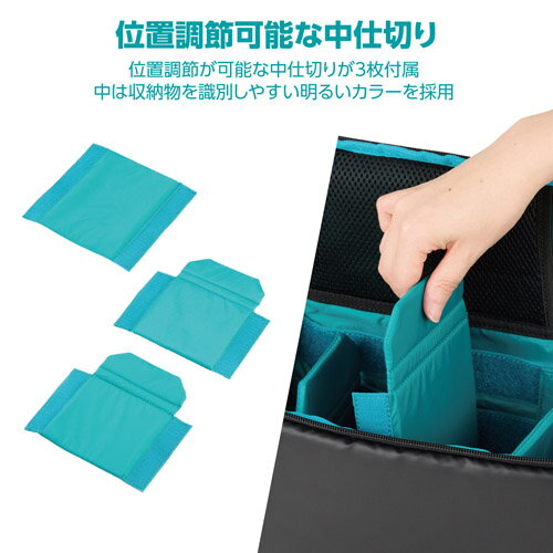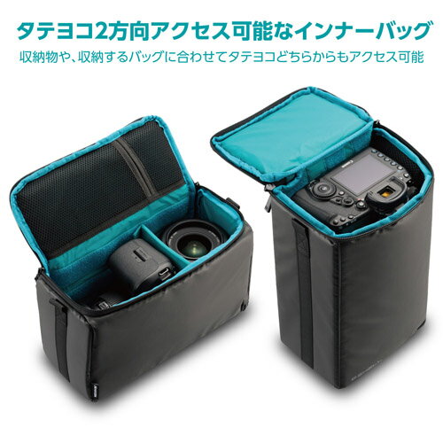 【アウトレット 訳あり特価】商品本体やパッケージに多少のスレや汚れ等がありますが、商品状態は良く使用上の問題はございません。個々の状態についてのお問い合わせにはお答え出来ませんので、予めご了承ください。タテヨコ2方向アクセス可能なインナーバッグ【商品仕様】内寸法:約W295×H175×D120mm外寸法:約W315×H200×D140mm重量:約430g材質:ポリエステル付属品:中仕切り×3ショルダーベルトショルダーパッド収納物や、収納するバッグに合わせてタテヨコどちらからもアクセスできるインナーバッグです。普段使いのバッグやスーツケースに入れてカメラを持ち運ぶことができます。付属のショルダーベルトを使用することで、タテヨコどちらの向きでもショルダーバッグとして持ち運ぶこともできます。 タテヨコ2方向アクセス可能なインナーバッグ収納物や、収納するバッグに合わせてタテヨコどちらからもアクセスできるインナーバッグです。位置調節可能な中仕切り 位置調節が可能な中仕切りが3枚付属します。中は収納物を識別しやすい明るい色を採用しています。 収納例【収納例1】標準レンズ付きフルサイズ一眼カメラと交換レンズ1本。【収納例2】70-200mmクラスの望遠レンズ付きフルサイズ一眼カメラ。フタの内側には立体メッシュポケットを備えており、レンズキャップやクロス等の小物の収納に便利です。 水や汚れに強いPUコーティング素材水や汚れに強いPUコーティング素材を採用しています。 不意にファスナーが開かない自動ロック機能付きファスナー不意にファスナーが開くのを防止するYKK社の自動ロック機能付きファスナーを採用しています。引手を持たないとファスナーが開きません。 タテヨコどちらも可能なショルダー仕様付属のショルダーベルトを装着してショルダーバッグとしても使用ができます。ショルダーベルトの取り付け位置を変えることで、タテヨコどちらでも持ち運びや機材の出し入れができます。 普段使いのバッグに入れてトートバッグやバックパックなど普段お使いのバッグに入れるだけで、本格的なカメラバッグとしての機能と安心を付加させられるインナーバッグです。 スーツケースに入れてスーツケース内のインナーバッグとしても便利にお使いいただけます。 そのまま保管できるインナーバッグインナーバッグをバッグから出したまま保管できます。※カメラ機材を入れたたままでの長期間の保管には向かないのでご注意ください。サイズショルダーベルト取付け方法ショルダーベルトのフックは通したあとに金具部分を閉じてご使用ください。開いたまま使用すると破損し、バッグが落下する恐れがあります。