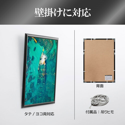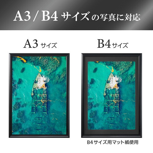 UVカットPET板を使用したシンプルなデザインのA3サイズ用アルミ額縁。B4サイズも飾れるマット紙(中額)付き。【商品仕様】フレーム材質:アルミ製額縁外寸法:約W319×H442×D11mm画面サイズ:A3:約283×406mm(マット紙なし)\nB4:約247×354mm(マット紙あり)マット外寸法:約W297×H420×D0.2mmマット仕様:ビク抜きマット紙重量:約610g吊りヒモ:ありスタンド:なしパッケージ:PE袋優しいラウンド形状に細いラインがアクセントのアルミ額縁です。シンプルなデザインでどんな作品とも相性が良く、写真だけでなくポスターやPOP展示など、幅広い用途に使用できます。前面板には写真の色あせを大幅に軽減するUVカットPET板を使用。軽量で割れにくく、万が一の落下時も安心です。A3/B4サイズの写真に対応A3サイズの写真やポスターなどがそのままピッタリと納まります。付属のマット紙(中額)を使うことでB4サイズも飾ることができます。壁掛けに対応付属品の吊りヒモと裏面の吊り金具を使用して壁掛けでの使用が可能です。タテ・ヨコどちらにも対応するよう4つの吊り金具がついています。シンプルなアルミフレーム優しいラウンド形状に細いラインがアクセントのアルミフレーム。存在を主張し過ぎないシャープでシンプルなアルミの質感が写真を引き立てます。フレーム形状イメージUVカットPET板前面板には90%以上のUVカット効果があるPET板を使用しています。窓辺の日差しや蛍光灯などからの紫外線を大幅に軽減し、長期間の展示による写真の色あせや劣化を抑制します。また、PET板は軽くて割れにくいのでガラスと違い万が一落としたときでも安心です。※UVカットは劣化を完全に防ぐものではありません。製品サイズ使用イメージパッケージ