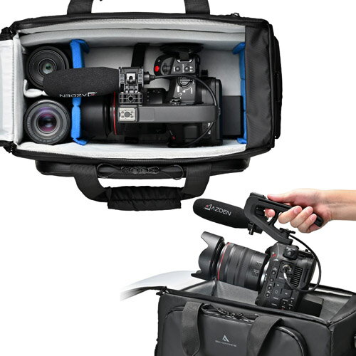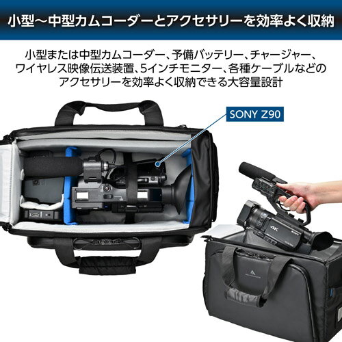 プロフェッショナルな撮影を支えるカムコーダー用ショルダーバッグ【商品仕様】カメラ収納部内寸法:約W395×H230×D190mm外寸法:約W440×H260×D240mm容量:約16L重量:約1900g材質:PUコーティングポリエステル、ポリエステル、ターポリン付属品:中仕切り×7、機材固定ベルト、ショルダーベルト主な収納可能機種:SONY PXW-Z200/PXW-Z90/PXW-X70/FX3 CANON XA75/XA70/XA60 PANASONIC AG-CX20/HC-X1600/HC-X2100先進的な機能性と卓越した収納性を追求し、カメラマンの多様な撮影スタイルに応えた本格志向のモデルを展開する「GW-ADVANCE」シリーズ。プロフェッショナルからアマチュアまで、すべてのユーザーの創造性を最大限に引き出すカメラバッグブランドです。「タンク カムショルダーバッグ16」は、小型または中型カムコーダーと周辺アクセサリーを効率的に収納できる、プロの現場での使いやすさを追求したショルダーバッグです。機内持ち込みサイズに対応する無駄のないスクエアデザインに、6面すべてに厚みのあるクッション材とボード材を内蔵した堅牢な構造が機材をしっかりと保護します。大きな開口部は機材を一覧しやすいだけでなく、カメラをすばやくスムーズに出し入れ可能。また、水に強い生地素材と止水ファスナーを採用しているため、急な天候変化に見舞われる屋外ロケでも安心して持ち運べます。※水の侵入を完全に防ぐものではありません。小型~中型カムコーダーとアクセサリーを効率よく収納小型または中型のカムコーダーに加えて、予備バッテリー、チャージャー、ワイヤレス映像伝送装置、5インチモニター、各種ケーブルなどのアクセサリーを効率よく収納できるよう最適化された内部設計です。内装には明るいグレーを採用しているため、車内や暗所での作業時でも収納物が見やすく、スムーズに作業できます。シネマカメラと交換レンズの収納にも対応メイン収納部は、レンズを装着したシネマカメラ本体に加え、交換レンズを縦向きに2本収納できる十分な高さを確保しています。シネマカメラと複数のレンズを効率的に持ち運び、撮影現場でのレンズ交換にも迅速に対応できます。大型レンズを装着した一眼カメラの収納にも対応中仕切りのレイアウトを調節することで、一眼カメラ用の大型レンズの収納にも対応。300mm F2.8クラスの超望遠レンズを装着したプロ用一眼カメラをフード逆付けでそのまま収納することも可能です。移動時のズレを防ぐ固定ベルト移動中のカメラの揺れを防止するため、機材固定ベルトを装備しています。このベルトは、内部で取り付け位置をスライド調節できるため、収納する機材のサイズや形状に合わせて最適な位置でしっかりと固定でき、大切な機材を保護します。ケーブルや周辺機器の収納に便利な大型ポケットフロントには、BNCケーブルやワイヤレスマイク等の周辺機器収納に最適な大型ポケットを装備しています。ポケット内部には、小分け用メッシュポケットと、ケーブルをすっきりまとめられるケーブルバンドも備えており、細かなアイテムを整理して収納できます。フレキシブルな中仕切り収納物に合わせて位置調節や着脱が可能な大小2サイズの中仕切りを備えています。小型の中仕切りは、縦、横どちらの方向にもフレキシブルに曲げて使えるので、レンズなどに沿わせて配置したり、バッテリーや小物が移動中に動かないよう、蓋のようにかぶせたりすることで、機材をしっかりと固定できます。 便利な各部外部収納 撮影現場で役立つ外部収納スペースを各所に備えています。背面には、チケットやノートやなどを収納できるスリムなポケットを装備。また、左サイドにはメジャーやテープ類などの小物を収納できるマチ付きポケットを、右サイドには名刺が収納できる専用ポケットを備え、細かなアイテムも整理して持ち運べます。 樹脂製ハンドル&リングプラーでスムーズな開閉操作 天面の開口部は、しっかりと握れて開閉時に安定した操作を可能にする樹脂製ハンドルとダブルファスナーを採用し、一気に大きく開くことが可能です。また、各開閉部のファスナーには、グローブを装着したままでも指をかけやすく、スムーズに開閉できるリングプラーを採用しています。 マグネット式で静音性と操作性を両立 ハンドルカバーと天面のメイン開口部にはマグネット式を採用。面ファスナー式に比べて開閉が簡単で、音も発生しないため、静音性が求められる撮影現場で特に重宝します。 大型パッド付きショルダーベルト 厚いクッション材が入った大型ショルダーパッドが肩にしっかりとフィットし、衝撃を効果的に吸収します。肩への負担を軽減し、長時間の使用でも疲れにくく、快適な背負い心地を提供します。パッドの裏側には肩からのズレ落ちを防止する滑り止めライン加工が施されています。ショルダーベルトは必要に応じて着脱が可能です。 両手でしっかり持てるキャリーハンドル 自動車や交通機関などでの移動時、積み下ろしに便利なキャリーハンドルを