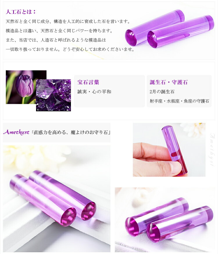 紫水晶・Citrine印鑑 【送料無料】 【10年保証】 愛と癒しをもたらす、恋愛成就の石 平和・愛の告白・真実の愛・美 ●印鑑サイズ 直径10.5mm×長さ60mm(認印) 直径12.0mm×長さ60mm(認印・銀行印) 直径13.5mm×長さ60mm(女性実印) 直径15.0mm×長さ60mm(男女兼用実印・銀行印) 直径16.5mm×長さ60mm(男性実印) 直径18.0mm×長さ60mm(やや大きい) ●配送方法 この商品は、ネコポス便にて発送いたします。 ●ケース 印鑑ケース:鶴亀(赤・黒) ●保証 お客様が当店にてお買い上げいただいた印鑑は、ご購入日より、10年以内であれば、無料で彫り直しをいたします。(送料は往復分ご負担ください。)