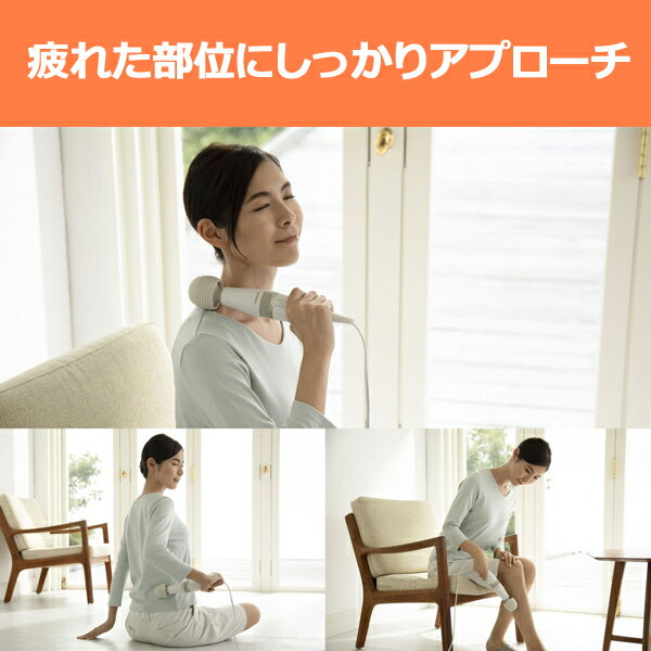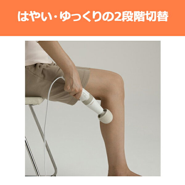 【 商品仕様 】 ■医療機器認証番号 : 226AKBZX00050A01 ■医療機器の種類 : 管理医療機器 ■一般的名称 : 家庭用電気マッサージ器 ■定格 : AC100V 50/60Hz 10W ■定格時間 : 20分 ■振動回数 : はやい:約6700回/分 ゆっくり : 約5200回/分 ■外形寸法 : 直径(振動ヘッド)約6cm×長さ 約30cm ■質量 : 約420g ■電源コード長さ : 約2m ■材質 : 本体 / PC樹脂 振動ヘッド / EVA樹脂 ■電気代の目安(月) : 約4円(1日30分使用)新電力料金目単価31円/kWh(税込)で計算心地よいマッサージで、手軽にリフレッシュ。 ▼ 柔軟性のある振動ヘッドがマッサージしたい部位にフィットします。 ▼振動は「はやい・ゆっくり」が選べる2段階切替式です。 首・肩(鎖骨にあてない) 背中・腰 ふくらはぎ ※ 頭、胸、腹、骨部へは使用しないでください。 【 商品仕様 】 ■医療機器認証番号 : 226AKBZX00050A01 ■医療機器の種類 : 管理医療機器 ■一般的名称 : 家庭用電気マッサージ器 ■定格 : AC100V 50/60Hz 10W ■定格時間 : 20分 ■振動回数 : はやい/約6700回/分 ゆっくり/約5200回/分 ■外形寸法 : 直径(振動ヘッド)約6cm×長さ 約30cm ■質量 : 約420g ■電源コード長さ : 約2m ■材質 : 本体 / PC樹脂 振動ヘッド / EVA樹脂 ■電気代の目安(月) : 約4円(1日30分使用)新電力料金目単価31円/kWh(税込)で計算 ※写真、イラスト、グラフィック処理された映像や画像は全てイメージです。 ※製品の材質、光源の種類・明るさにより、色の見え方が異なる場合があります。 ※また、実物とでは多少色味が異なる場合があります。あらかじめご了承ください。 ※製品の仕様は予告なく変更する場合があります。 ※ご購入・ご使用の前に安全に関するご注意やご使用方法を必ず取扱説明書でご確認ください。