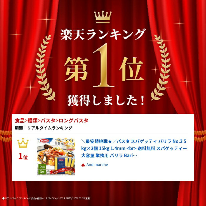 リニューアルに伴い、パッケージ・商品仕様等予告なく変更する場合がございます。予めご了承ください。 パッケージに小さな穴が開いておりますが、こちらはパスタを入れる際に含まれた空気を抜くための空気穴です。商品に問題はございません。 本場イタリアで3人に1人が選ぶパスタブランド!イタリアで一番人気No.1のおいしさです♪デュラム小麦の味わいをしっかり感じられる、もちもち・ぷりぷりの食感です。バリラ社は1877年イタリア北部、パルマにオープンして以来、常に高品質のパスタを送り出すために代々受け継がれた技術を守り続けています。 ●内容量:5kg×3 ●太さ:約1.4mm ●ゆで時間:約5分 ●原産国:イタリア ●原材料:デュラム小麦のセモリナ ●メーカー:バリラ(Barilla) ●保存方法:高温多湿の場所、直射日光を避けて保存してください。 ※細かな斑点はデュラム小麦のセモリナに由来するもので品質には問題ございません。また品質を保つため、なるべく別の瓶などに入れ替えて密閉して保存することをお勧めします。 ※予告なくリニューアルとなる場合があり、こちらに掲載の情報がパッケージデザイン含め実際の商品と一部異なる場合がございます。予めご了承の上ご注文を頂きますようお願い致します。 最強翌日配送対象商品に関するご案内 最強翌日配送対象商品・対象地域に該当する場合は最強翌日配送マークがご注文カゴ近くに表示されます。 最強翌日配送可能なお支払方法は【クレジットカード、代金引換、全額ポイント支払い】のみとなります。 下記の場合は最強翌日配送対象外となります。 ・15点以上ご購入いただいた場合 ・時間指定がある場合 ・ご注文時備考欄にご記入がある場合 ・決済処理にお時間を頂戴する場合 ・郵便番号や住所に誤りがある場合 ・最強翌日配送対象外の商品とご一緒にご注文いただいた場合 ・お届け先住所文字数が40文字以上の場合 関連キーワード(本商品の説明ではありません)母の日 父の日 敬老の日 こどもの日 クリスマス バレンタイン ホワイトデー ハロウィン お正月 成人の日 成人式 記念日 誕生日 卒業式 入学式 お歳暮 お中元 春 夏 秋 冬 梅雨 節分 ひな祭り 七夕 十五夜 初詣 年越し 夏祭り 花火大会 結婚祝い 内祝い 出産祝い 快気祝い 還暦祝い 古希 喜寿 傘寿 米寿 卒寿 白寿 百寿 新築祝い 引っ越し祝い 開店祝い 開業祝い 就職祝い 昇進祝い 合格祝い 銀婚式 金婚式 七五三 長寿祝い 御礼 お母さん お父さん 義母 義父 祖父 祖母 おばあちゃん おじいちゃん 娘 息子 彼氏 彼女 恋人 友達 上司 先輩 後輩 同僚 キッズ 子供 幼児 ベビー 赤ちゃん 育児 学生 社会人 シニア 10代 20代 30代 40代 50代 60代 70代 80代 90代 一人暮らし 単身赴任 主婦 主夫 新生活 家族暮らし 子育て 旅行 トラベル ライブ ホームパーティ ビジネス 法人 ギフト プレゼント
