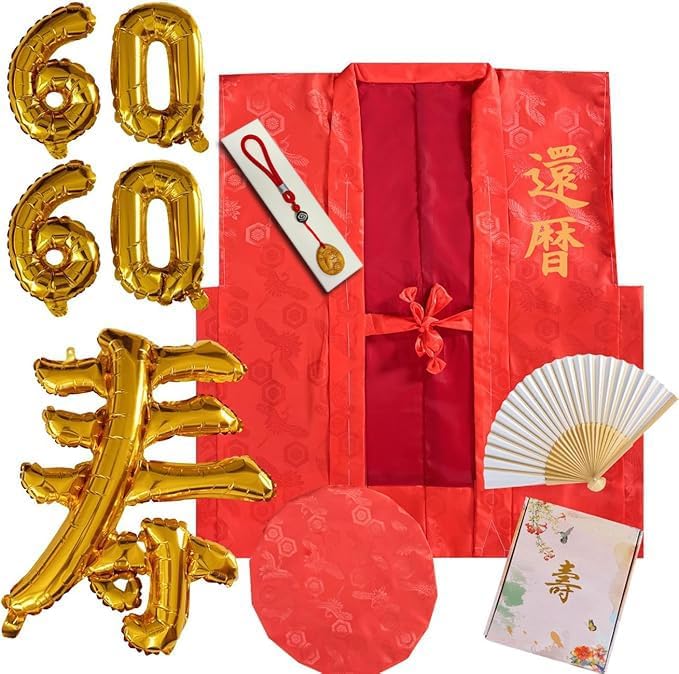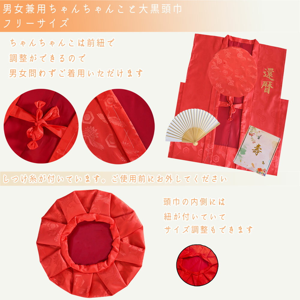 【本体】 素材:ポリエステル100% サイズ: 着丈 約75cm 身幅 約62cm 肩幅 約58cm 紐 約30cm 材料の詳細: ちゃんちゃんこと頭巾の生地に、縁起のよい「鶴」と「亀甲文」の模様が入っており、 上品な光沢、高級感があります。 【風船】 素材:アルミフィルム サイズ:「寿」約60×75.5cm 「数字」約24×40cm ※空気を入れる用ストロー付き。 【木彫りセット内容】 ●赤:「還暦」印字付き赤ちゃんちゃんこ、大黒頭巾、白扇子、栞、化粧箱、「寿」風船1枚、「6」「0」風船各2枚、「還暦」印字付きツゲの木彫り ●紫:「古希」印字付き紫ちゃんちゃんこ、大黒頭巾、白扇子、栞、化粧箱、「寿」風船1枚、「7」「0」風船各2枚、「古希」印字付きツゲの木彫り ●黄:「米寿」印字付き黄ちゃんちゃんこ、大黒頭巾、白扇子、栞、化粧箱、「寿」風船1枚、「8」風船4枚、「米寿」印字付きツゲの木彫り 男性、女性問わずに着れるフリーサイズ。 ご夫婦で代わる代わるご着用いただくことも可能です。 前紐を結んでサイズ調整をしてください。 還暦・古希・喜寿・傘寿・米寿・卒寿お祝いの時の記念写真撮影用にピッタリな基本セットです。 ご両親・友人・上司へ「おつかれさまでした」という感謝の気持ちを込めて、 ちゃんちゃんこを送ったら、大切な人がきっと喜んでくれますね。 注意事項 ・当店の商品は全て国内から配送されます。 ・国内配送の商品は国内でのお買い物と同じく消費税が発生いたします。関税はかかりません。 *色がある場合、モニターの発色の具合によって実際のものと色が異なる場合がある。