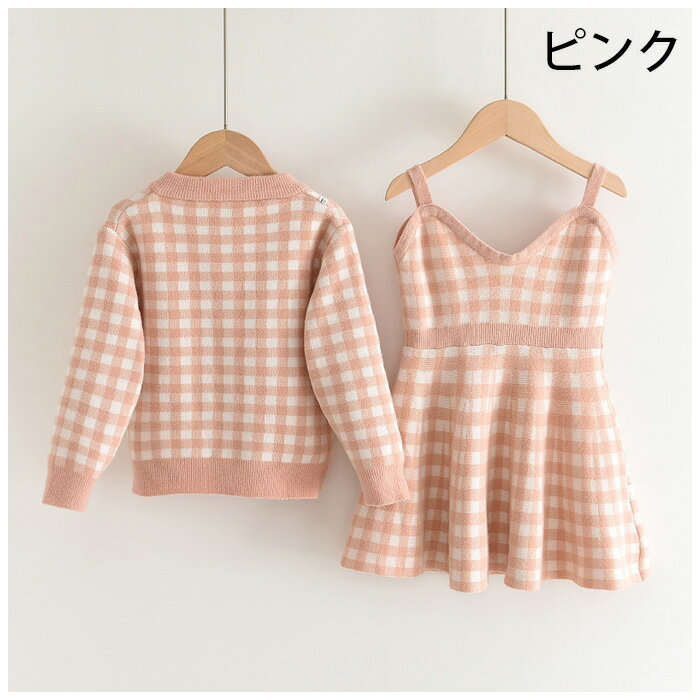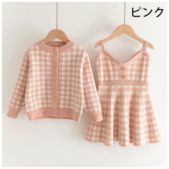 韓国子供服 セットアップ 女の子 春秋 新品 ニット 2点セット 発表会 七五三 撮影写真 パーティー イベント 誕生日 結婚式 キッズ ニットカーディガン+ニットキャミソールワンピース オシャレ 可愛い チェック柄 姉妹 双子 プレゼント お祝い 春着 秋着 100 110 120 130 140
