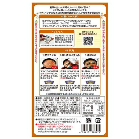 調味料 たれ / タレ はこちら 日本食研 はこちら 名称:味噌煮のたれ 調味料 内容量:味噌煮 たれ 1袋(110g)×12 賞味期限:みそ煮 たれ は2ヶ月以上 保存方法:調味料 料理の素 は、開封前は直射日光を避けて常温で保存してください。 製造者:日本食研 製造 株式会社 配送区分:味噌煮のたれ 送料無料 常温 便 送料:みそ煮 タレ 送料無料・送料込み 発送元:北海道 ギフト・タネ 実 「 味噌煮のたれ 送料無料 味噌煮 たれ 日本食研 みそ煮 タレ 濃縮タイプ 調味料 料理の素 」原材料:味噌(国内製造)、砂糖、清酒、生姜、かつおエキス、酵母エキス、昆布エキス/調味料(アミノ酸等)、カラメル色素、(一部にさば・大豆を含む) 濃厚な合わせ味噌や、かつおと昆布の旨みでコク深い味わいの味噌煮です。 フライパンで10分煮るだけの簡単調理 材料(3~4人前) 生サバの切り身 3~4切れ(約300~400g) 水 200ml(カップ1) 本品 1袋 ※ブリ、サンマ、イワシ、サワラ、タラなどでも作れます。 下ごしらえ キッチンペーパー等で表面の水分を軽くふき取り、皮面に十字の切り込みを入れます。 味噌煮の作り方 1、煮立たせる フライパンに本品1袋と水200mlを入れ、 よくかき混ぜた後、煮立たせます。 2、落し蓋として煮込む 皮面を上にして切り身を並べ、アルミホイルで落し蓋をして、中火で約8分煮込みます。 3、煮詰める 落し蓋をとり、たれにとろみがつくまで約2分煮詰めたら出来上がりです。 ※加熱時間は目安です。切り身の大きさによって異なります。 栄養成分表示 エネルギー259kcal たんぱく質5.8g 脂質2.4g 炭水化物53.6g 食塩相当量6.7g 「 味噌煮のたれ 送料無料 味噌煮 たれ 日本食研 みそ煮 タレ 濃縮タイプ 調味料 料理の素 」