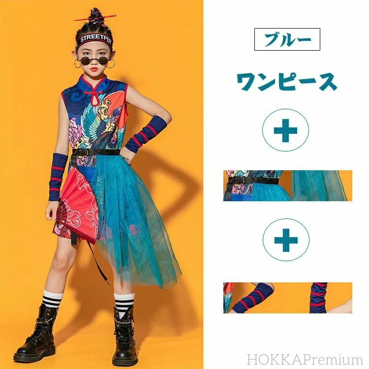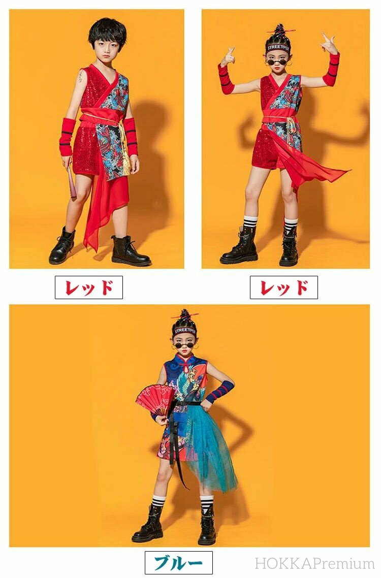 【送料無料】浮世絵 ダンス 衣装 和風 キッズ ヒップホップ 女の子 男の子 赤 キッズ ダンス 衣装 スパンコール トップス レッド ネイビー パンツ 短パン 派手 きれいめ