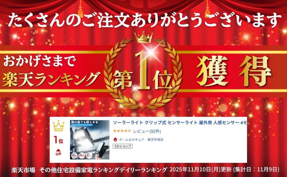 商品情報型式GS-SCL-169-2JAN4580383123573商品名クリップオンライト 2個セット本体寸法9.6×167×8.5cm重量約380g光源460lm防水等級IP65電源18650リチウムイオン充電池付属品"取付用ネジ×2本、アンカー×2本、壁面取付ブラケット、両面テープ付フック×2"製品保証製品到着日より1年間注意※商品改良のため、仕様・外観は予告なしに変更することがありますのでご了承ください。この商品は NEW【2個セット】センサーライト ソーラーセンサーライト クリップオンライト クリップ式 キャンプライト 防犯ライト 人感センサー 屋外 防水 ledスポットライト コードレス ledライト 照明 作業灯 防災 災害 アウトドア ライト ガーデンライト ソーラー 充電 太陽光 常夜灯 ポイント【2個セット】センサーライト ソーラーセンサーライト クリップオンライト クリップ式 キャンプライト LEDランタン ライト アウトドア キャンプ 防水IP65 照明メーカー検査合格品 【3つの点灯モードで使えます】 ■夜間待機モード:周囲が暗くなると弱発光します。人を検知すると強発光し、15秒後弱発行に戻ります。■検知発行モード:周囲が暗くなっても発光しません。人を検知すると強発光し15秒後に消灯します。■常時発行モード:周囲が暗くなると常時発光します。(センサーは作動なし)満充電時で最長約10時間連続発光が可能です。 ショップからのメッセージ 納期について 4