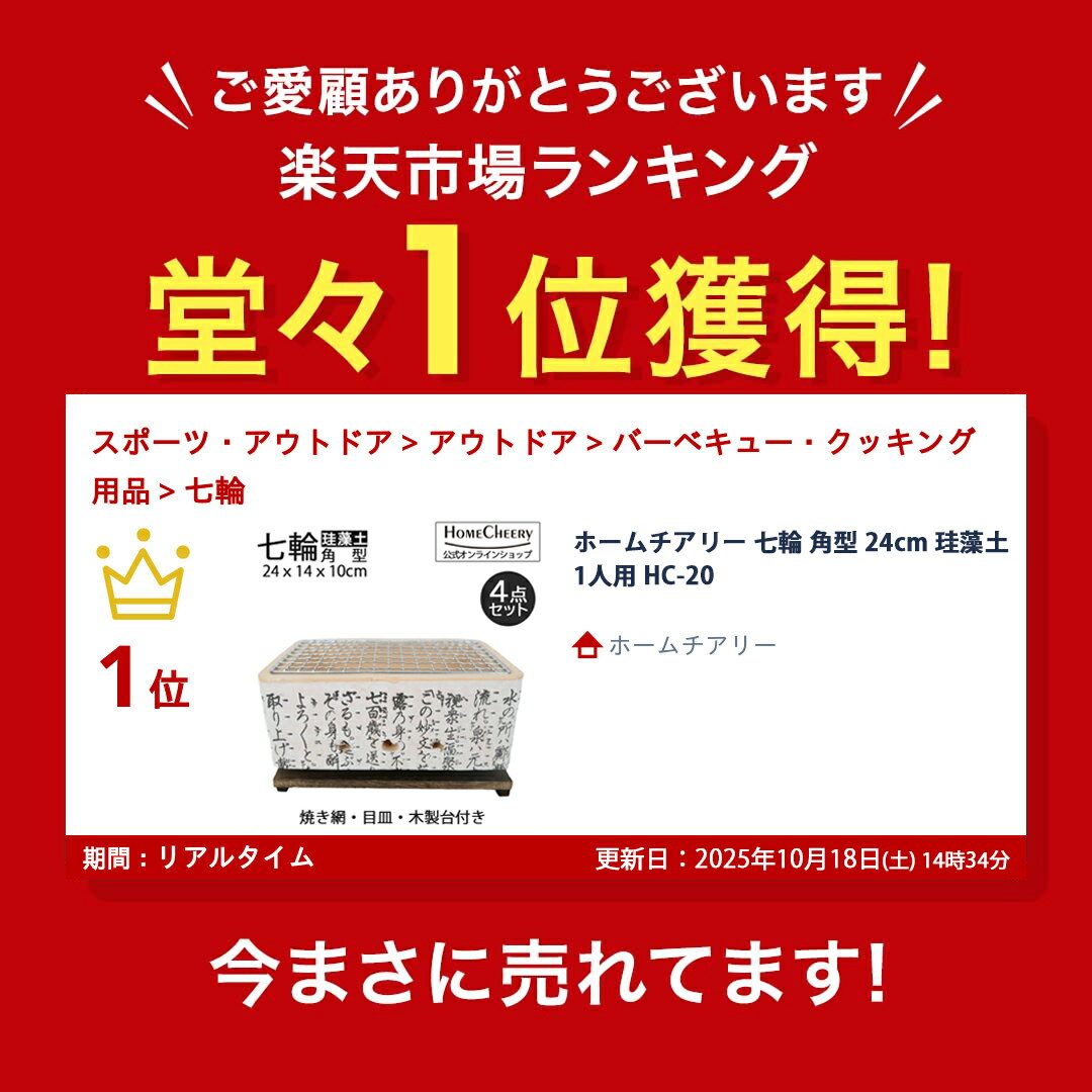 商品情報商品名【商品名】角型七輪 民藝商品内容【商品内容】七輪本体、焼き網、目皿、木板サイズ【サイズ】本体:24cmx14cmx10m焼き網:22x10cm目皿:19x9cm材質【材質】本体:珪藻土 網:クロムメッキ目皿:ステンレス台座:木製重量【重量】(約)2.9kgメーカー名【メーカー名】Home Cheery原産地【原産地】中国品番【品番】HC-20商品説明【商品説明】珪藻土で出来た七輪です。商品の特性上、細かなヒビ、かけが存在しますが使用上の問題ございません。3mm前後の個体差がございます。1~2人用少量の炭で短時間でも効率よく焼けるので、軽い晩酌や一人焼肉にピッタリです!・炭火焼きの香ばしい風味と、ふっくらジューシーな仕上がりを簡単に楽しめる珪藻土七輪です!家族や友人とのバーベキューが一気にプロの味に。・珪藻土の特徴として、少ない炭でもパワフルな火力をキープします。じっくり焼けるので、どんな食材でも美味しく仕上がります!・七輪は組立不要なので、庭先やキャンプで準備や片付けが簡単!使用上の注意【使用上の注意】・七輪は一酸化炭素を発生させるため、屋外や十分に換気された場所で使用してください。室内や換気の不十分な場所での使用は、一酸化炭素中毒のリスクがあります。・七輪は高温になるため、安定した平らな場所に設置してください。傾いたり、ぐらついたりすると、転倒や火災の原因になります。・七輪の周囲には、燃えやすいもの(紙、布、木材など)を置かないでください。火災のリスクを避けるため、十分なスペースを確保しましょう。・着火の際には、専用の着火剤を使用し、ガソリンやアルコールなどの引火性の高い液体は使用しないでください。急激に炎が上がり、事故の原因になります。・使用中は七輪本体が非常に熱くなるため、素手で触らないようにしてください。やけどのリスクを避けるため、耐熱グローブを使用しましょう。・七輪の火を消すために水をかけるのは避けてください。急な冷却で七輪が割れたり、練炭が飛び散ったりする恐れがあります。火を消す際は、自然に鎮火させるか、専用の消火カバーを使用しましょう。・使用後も七輪や炭は長時間熱を持っています。完全に冷えるまで触らないようにし、周囲の物に引火しないように注意してください。・使用後の七輪や残った炭は完全に冷ましてから保管してください。湿気の少ない乾燥した場所に置き、次回使用時も安全に扱えるように管理します。 \こちらもオススメ/七輪 コンロ 角型 24cm 焼き網付き 4点セット 置き台付き 一人焼肉 焼き鳥 卓上 BBQ 珪藻土 大名コンロ ホームチアリー HC-20 七輪 卓上 バーベキュー 焼肉 炭火 アウトドア コンロ キャンプ 丸形 角形 珪藻土 耐久性 軽量 日本製 おしゃれ 人気 グリル 省スペース 持ち運び 伝統 焼き鳥 5