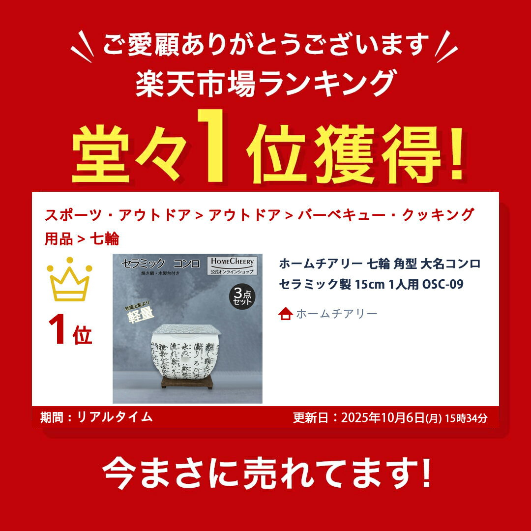 商品情報商品名【商品名】セラミック角型コンロ 民藝商品内容【商品内容】本体、焼き網、木板サイズ【サイズ】本体:14.7cmx14.7cmx12m焼き網:15x15cm材質【材質】本体:セラミック 網:クロムメッキ台座:木製重量【重量】(約)1.1kgメーカー名【メーカー名】Home Cheery原産地【原産地】中国品番【品番】OSC-09商品説明【商品説明】従来の珪藻土の代わりにセラミックファイバーを使用したセラミックコンロです。3mm前後の個体差がございます。1~2人用少量の炭で短時間でも効率よく焼けるので、軽い晩酌や一人焼肉にピッタリです!・炭火焼きの香ばしい風味と、ふっくらジューシーな仕上がりを簡単に楽しめるセラミックコンロです!・珪藻土と同等の保温性があるため、少ない炭でもパワフルな火力をキープします。じっくり焼けるので、どんな食材でも美味しく仕上がります!使用上の注意【使用上の注意】・コンロは一酸化炭素を発生させるため、屋外や十分に換気された場所で使用してください。室内や換気の不十分な場所での使用は、一酸化炭素中毒のリスクがあります。・コンロは高温になるため、安定した平らな場所に設置してください。傾いたり、ぐらついたりすると、転倒や火災の原因になります。・コンロの周囲には、燃えやすいもの(紙、布、木材など)を置かないでください。火災のリスクを避けるため、十分なスペースを確保しましょう。・着火の際には、専用の着火剤を使用し、ガソリンやアルコールなどの引火性の高い液体は使用しないでください。急激に炎が上がり、事故の原因になります。・使用中はコンロ本体が非常に熱くなるため、素手で触らないようにしてください。やけどのリスクを避けるため、耐熱グローブを使用しましょう。・コンロの火を消すために水をかけるのは避けてください。急な冷却でコンロが割れたり、練炭が飛び散ったりする恐れがあります。火を消す際は、自然に鎮火させるか、専用の消火カバーを使用しましょう。・使用後もコンロや炭は長時間熱を持っています。完全に冷えるまで触らないようにし、周囲の物に引火しないように注意してください。・使用後のコンロや残った炭は完全に冷ましてから保管してください。湿気の少ない乾燥した場所に置き、次回使用時も安全に扱えるように管理します。七輪 コンロ 角型 セラミック製 15cm 焼き網付き 3点セット 置き台付き 一人焼肉 焼き鳥 卓上 BBQ 軽量 大名コンロ OSC-09 ホームチアリー 七輪 卓上 バーベキュー 焼肉 炭火 アウトドア コンロ キャンプ 丸形 角形 珪藻土 耐久性 軽量 日本製 おしゃれ 人気 グリル 省スペース 持ち運び 伝統 焼き鳥 5