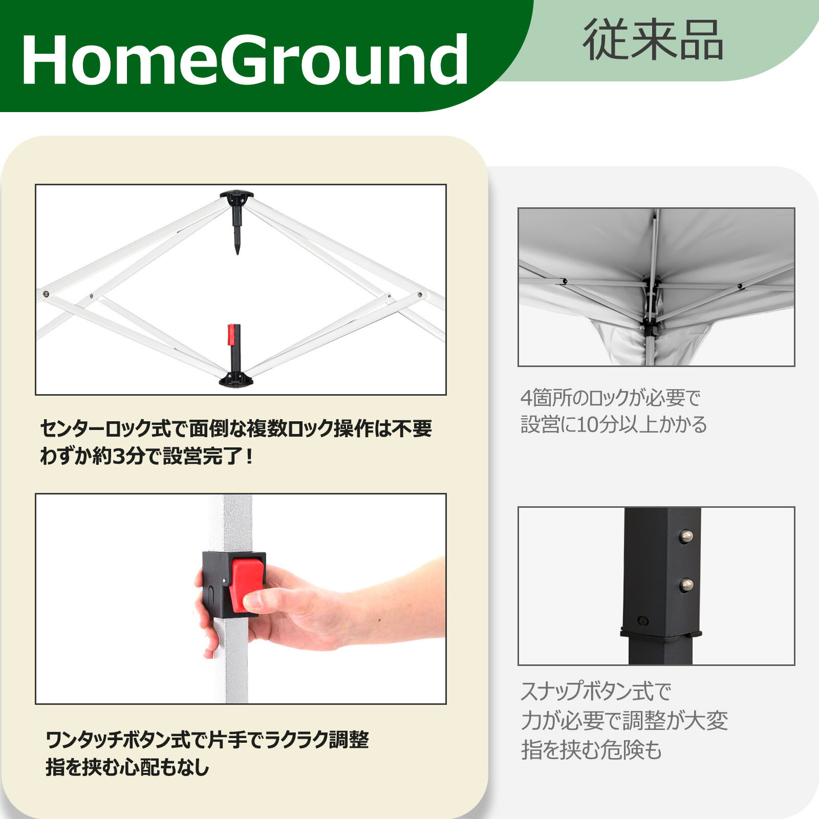 【革新的な「ワンタッチ構造」でわずか約3分簡単設営!】 女性でも簡単組み立て。従来の4点ロック式構造に比べて面倒な複数ロック操作は一切不要、設営・収納作業の効率が約70%向上し、設営時間と手間を大幅に削減できます! 【ボタン1つでラクラク高さ調節!】 革新的な「ワンタッチ機能」で高さ調整ももっと簡単&スムーズに。従来のスナップボタン式に比べて片手でラクラク調整、指を挟む心配もなし!女性や年配者でも楽々操作!さらに、革新設計で一般的な製品より+10cm高く、もっと便利&快適に使えます 【厚さ&強度アップで、抜群の安定感・耐久性!】 アウトドア仕様の頑丈なスチールフレームを採用しており、アルミ素材に比べてズッシリとした安定感があり、脚フレームから交差フレームや連結部などの細部に至るまで、風や衝撃にも強い設計でさらに安心! 【優れたUVカット&高耐水加工で安心】 生地裏面には紫外線から守るUPF50+シルバーコーティングが施され、強い日差しから肌を守るだけでなく、暑い夏の日でも涼しく快適な空間を提供します。さらに、生地表面には高品質420D防水塗装+縫い目からの雨漏れを防ぐシーム加工が施されているため、水を弾き、小雨程度の雨にもしっかり対応できます 【進化した付属品で、高まる安定性!】 【ポイント1】 より大きい脚プレートを採用: 地面にしっかりと食い込み、安定感がアップ! 【ポイント2】 より長いペグを採用: 強風でもしっかり固定、設置が簡単で安全性が向上! 【ポイント3】 より太くて丈夫なロープを採用: 耐久性が増し、さらに安心して使用できます! 【風抜けのベンチレーションで安全性アップ!】 天幕の中央には風抜けのベンチレーションを装備しており、風が通り抜けることで、風による転倒事故のリスクを軽減します 【製品仕様】 【サイズ 組立時】 (約)3.0m×3.0m×1.78m / 2.5m / 2.6m / 2.7m 【サイズ 収納時】 (約)117cm×19cm×20cm 【本体重量】 (約)13.5kg 【材質】 フレーム : スチール 【生地(天幕)】 ポリエステル(表面に420D防水コーティング、裏面にUPF50+シルバーコーティング) 【耐水圧】 2,000mm以上 【付属品】 本体のみ:ロープ×4本、ペグ×8本、 専用収納ケース 、取扱説明書(日本語) 本体+横幕1枚付属:専用サイドシート(横幕)×1枚、ロープ×4本、ペグ×8本、 専用収納ケース 、取扱説明書(日本語) 本体+横幕2枚付属:専用サイドシート(横幕)×2枚、砂袋×4個、ロープ×4本、ペグ×8本、 専用収納ケース 、取扱説明書(日本語)