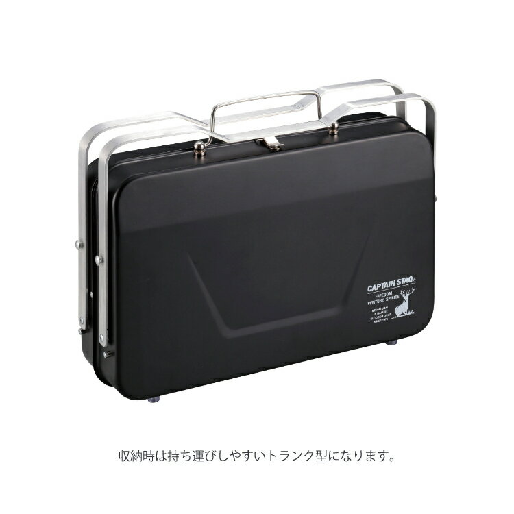 ★ キャプテンスタッグ UG-77 CSブラックラベル V型ファイアグリル<ワイド> CAPTAIN STAG CS BLACK LABEL Portable Folding BBQ Grill 焚き火・バーベキュー・ダッチオーブン・煮炊きの1台4役! アミとゴトクを使い分け、色々な調理を楽しめます。 ■卓上で使用できます。 ■煮炊きができるゴトク付き。2枚のゴトクで大小様々な鍋に対応できます。 ■ハーフサイズの網とゴトクでバーベキューと煮炊きが同時に楽しめます。 ■スライド式ゴトクで位置を変えられ、薪や炭の継ぎ足しが可能。 ■収納時は持ち運びしやすいトランク型になります。 型番:UG-77 JANコード:4560464274011 組立サイズ(約):幅395×奥行360×高さ340mm 収納サイズ(約):幅395×奥行95×高さ290mm 重量:3kg 網サイズ(約):300×160mm セット内容:本体×1、目皿(燃料用)×1、バーベキュー網×2、ゴトク×2、固定バー×2 材質: 本体:鉄(焼付塗装)、目皿・ハンドル:ステンレス鋼、脚・固定バー:アルミニウム合金、バーベキュー網・ゴトク:鉄(クロムめっき) ★ キャンプ アウトドア BBQコンロ UG-0077