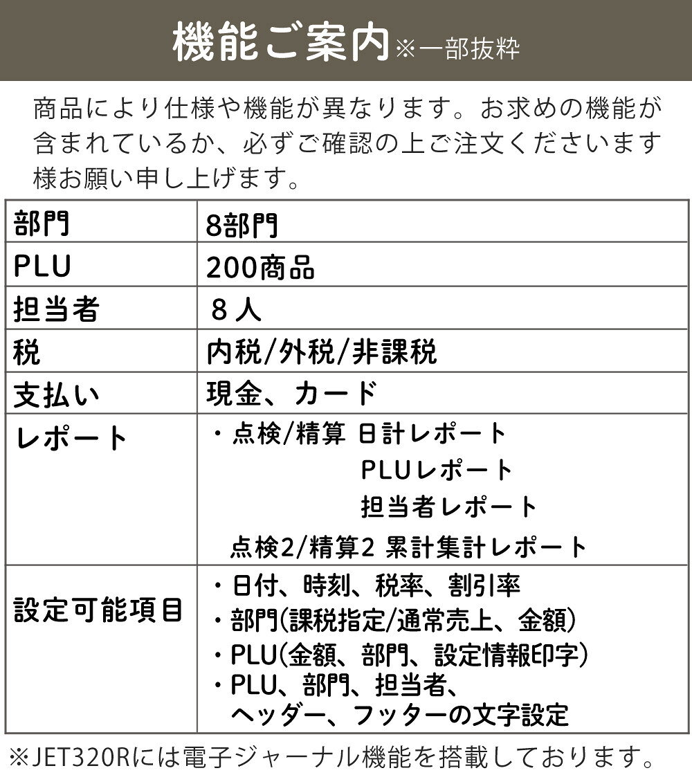 セット内容 1)クローバー電子 レジスター CL00R-9201R JET320R 【メーカー保証】1年間 【付属品】取扱説明書、ドロアキー2本 2)アルカリ乾電池 単3形 2本パック 1)クローバー電子 レジスター CL00R-9201R JET320R 軽減(複数)税率対応 JET320 クローバー普通紙小型レジスタードロア一体型 商品の特長 簡易領収書は売上レシートが発行されたあとに発行できます! 領収証 カードキーを押すことで、簡易領収書を発行できます。 レシートオフの状態でも簡易領収書の発行が可能です。 店名スタンプが押せるようにスペースを設定できます! 乾電池使用できます。単3型乾電池 2本(メモリー保護のため) 投げ込み式でロール紙交換がかんたん。 8部門対応 3紙幣・6貨幣対応の本体一体型手動式ドロアー。 コイントレー仕切り板の調整可能! サーマル(感熱)プリンタで鮮明な印刷 部門毎に異なる税率設定可能。 日付・時間は最初にセットすると、自動で更新されます。 消費税は「内税」「外税」「非課税」に対応しています。 安全上のご注意 ご使用前に、この「安全上のご注意」をよくお読みの上、正しくお使いください。 ここに示した注意事項は製品を安全に正しくお使い頂き あなたや他の人々への危害や損害を未然に 防止するためのものですので、必ず守ってください。 お願い(必ず守ってください) 1.温度が高くなる場所や、水がかかる所には置かないでください。 2.揮発性の液体でレジスターを拭かないでください。 3.乾電池は2本とも同種類の信頼のおけるメーカーの新品を使用してください。 4.乾電池は液漏れ等破損のあるものは使用しないでください。 5.乾電池が無い状態で電源を抜きますと、設定データ等が消去されます。 [消耗品のセットアップと交換] 電池を入れずに使用すると、日付、時刻、集計データ等が消えてしまいます。 電池交換は、コンセントにプラグを差した状態で行ってください。 プラグを差さずに交換すると、日付、時刻、集計数値等が消えてしまいます。 乾電池は、2本とも同種類の信頼のおけるメーカーの新品を使用してください。 乾電池のセット、交換 初めてお使いになる場合は、必ず乾電池(単三形2本)をセットしてください。 乾電池は1年に1回の交換を目安としてください。 電池交換は、コンセントにプラグを差した状態で行ってください。 手順のご注意 初めてお使いになる場合は、ロールペーパーをセットする前に、乾電池をセットしてください。 ・ロールペーパーの規格は、 紙幅57~58mm×外径60mm以下感熱紙タイプ 型式 JET320R 表示部 フロント:9桁セグメントタイプ液晶表示/リア:9桁セグメントタイプ液晶表示 印字部(プリンタ) SII社製 LTP01-245/印字方法:感熱紙方式(サーマル)/紙 幅:58mm/寿 命:約2000000行 設定データ 保持機能 単3形乾電池 2本使用/マンガン電池の場合 記憶保持期間:約1年 定格電圧 100V ±10V 周波数 100V ±10V 50/60Hz 定格消費電力 37.4W 機 能 部 門:8部門 PLU:200商品 担当者:8人 税:税率4種(初期値:税率1=8%,税率2~4=0%)内税/外税/非課税 支払い:現金、カード レポート:点検/精算 日計レポート 点検/精算 PLUレポート 点検/精算 担当者レポート 点検2精算2 累計集計レポート 設定可能な項目:日付、時間、税率(0~99%)、割引率(0~99.99%)/ 部 門/税、通常売上、単価 PLU:単価、部門、設定情報印字 担当者の暗証番号有効/無効(暗証番号3桁) PLU、部門、担当者、ヘッダー、フッターの文字設定 保証 お買い上げ日から1年間 検索ワード:レジスター クローバー電子 CLOVER レシート発行 簡易領収書発行 現金支払い 説明書付 JET320 電池使用 電池付 単3電池 JET-320R