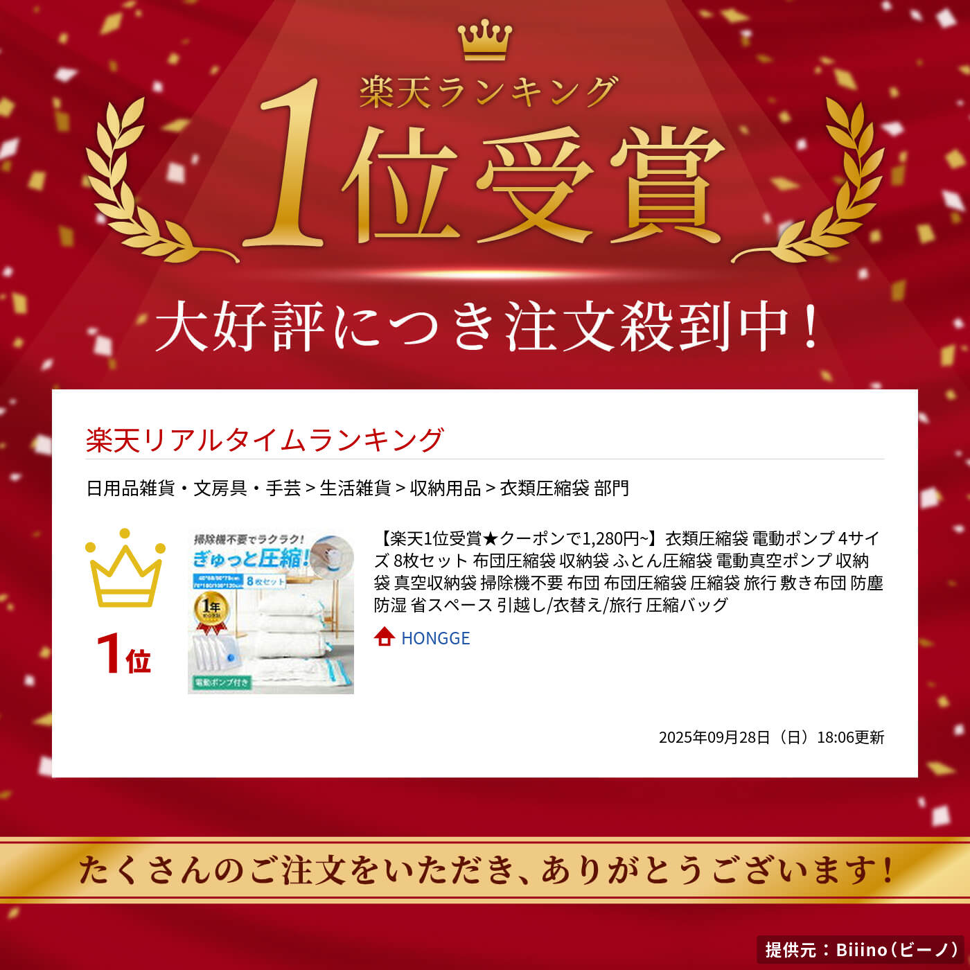 高密封&高耐久 真空収納袋 商品特徴 ▼こんなお悩みを解決 ▼ ・「季節衣類のカビが気になる」→ 完全密封で湿気遮断 ・「布団の収納に場所を取る」→ 体積1/4に圧縮可能 ・「真空袋がすぐ破れる」→ 軍用レベルの耐久性 もう二度と、衣類のダニ・カビに悩まされない! ▼中身が一目瞭然! 探す手間を大幅カット▼ ・旅行:スーツケース内で圧縮しながら中身を管理 ・引越し:段ボールに詰めても内容物が確認可能 ・防災備蓄:非常用衣類の状態を定期チェック もう、無駄に袋を全部開ける必要はありません!! ▼こんな方にこそ使ってほしい▼ ・大量の衣類圧縮が面倒な方 ・力の弱い女性や高齢者 ・引っ越し・災害備蓄用の収納を効率化したい方 もう、疲れる手作業とはサヨナラ! メーカー希望小売価格はメーカーサイトに基づいて掲載しています高密封&高耐久 真空収納袋 商品特徴 ▼こんなお悩みを解決 ▼ ・「季節衣類のカビが気になる」→ 完全密封で湿気遮断 ・「布団の収納に場所を取る」→ 体積1/4に圧縮可能 ・「真空袋がすぐ破れる」→ 軍用レベルの耐久性 もう二度と、衣類のダニ・カビに悩まされない! ▼中身が一目瞭然! 探す手間を大幅カット▼ ・旅行:スーツケース内で圧縮しながら中身を管理 ・引越し:段ボールに詰めても内容物が確認可能 ・防災備蓄:非常用衣類の状態を定期チェック もう、無駄に袋を全部開ける必要はありません!! ▼こんな方にこそ使ってほしい▼ ・大量の衣類圧縮が面倒な方 ・力の弱い女性や高齢者 ・引っ越し・災害備蓄用の収納を効率化したい方 もう、疲れる手作業とはサヨナラ!