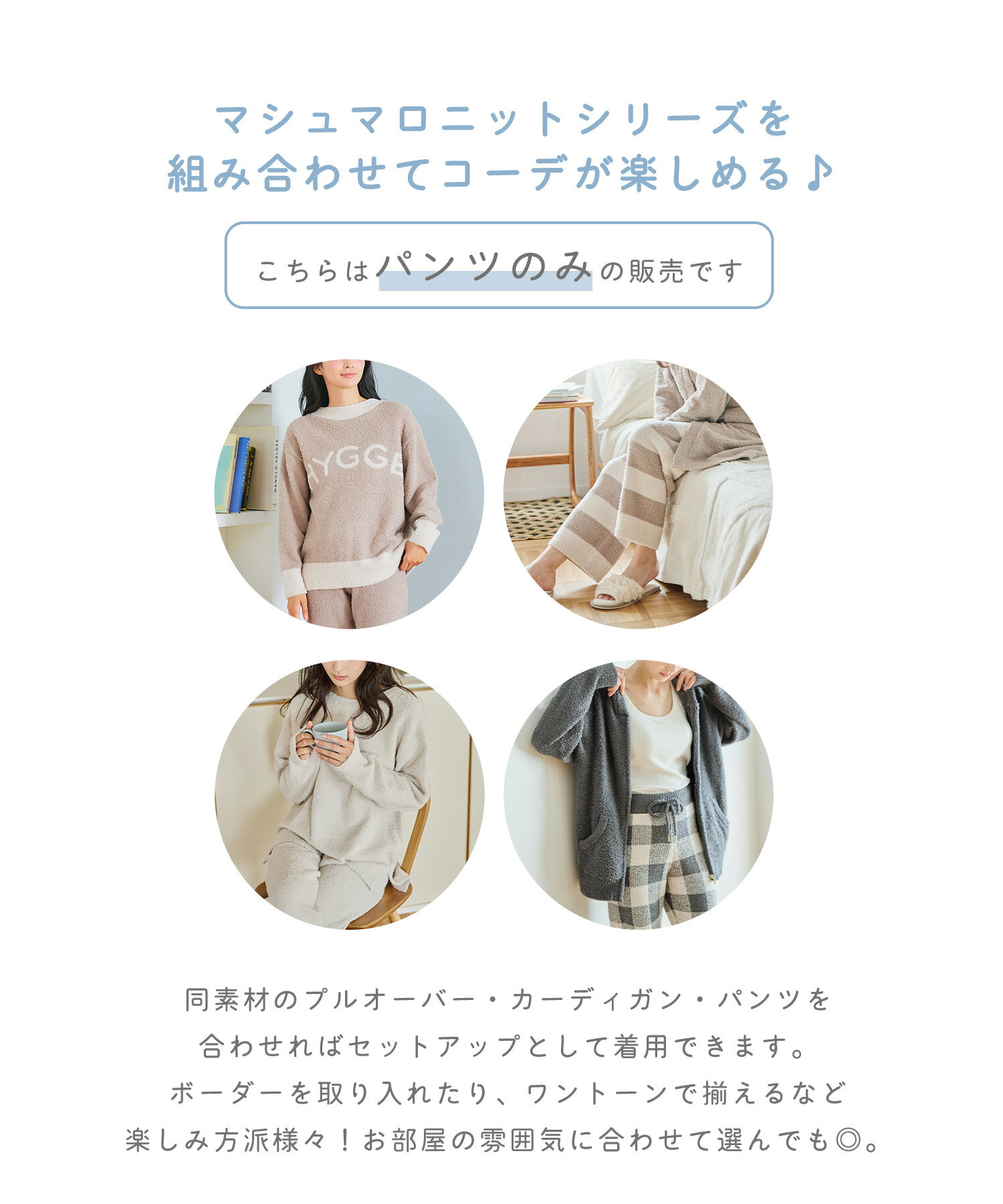 \人気のマシュマロニットシリーズに新型が登場!/ 今季はジョガーパンツシルエットが発売◎ 【デザイン】 ・ぽこぽこした素材がかわいらしいブークレニット素材を使用したルームウェアパンツ ・毛足が長く、マシュマロのようなふわふわとしたやさしい肌触りが特徴です。 ・ボトムスのパンツは裾がしまったジョガーパンツタイプ。ルーズなシルエットでゆったりとした穿き心地です。 ・ウエストはゴム仕様となっているので脱ぎ穿きもしやすく、ストレスフリー ・便利なポケット付き。スマートフォンやちょっとしたものを入れることができ、快適なおうち時間に。 同型のチェック柄Ver.(品番:680974)もございます◎ 【コーディネート】 ・同素材のパンツと合わせてセットアップで着用可能 ▼セットで着れる同素材の『マシュマロニット』シリーズはこちら 【LAFUKU/ラフク】もちふわマシュマロニットロングパンツ/ルームウェア 【LAFUKU/ラフク】もちふわマシュマロニットジョガーパンツ/ルームウェア 【LAFUKU/ラフク】もちふわマシュマロニットチェック柄ジョガーパンツ/ルームウェア 【LAFUKU/ラフク】もちふわマシュマロニットZIPパーカー/ルームウェア 【LAFUKU/ラフク】もちふわマシュマロニットVネックカーディガン/ルームウェア 【LAFUKU/ラフク】もちふわマシュマロニットHYGGEロゴトップス/ルームウェア 【LAFUKU/ラフク】もちふわマシュマロニットトップス/ルームウェア 【LAFUKU/ラフク】もちふわマシュマロニットロングガウンカーディガン/ルームウェア 【LAFUKU/ラフク】マシュマロニットもちふわネップニットロングパンツ/ルームウェア 【LAFUKU/ラフク】マシュマロニットもちふわネップニットVネックカーディガン/ルームウェア 【サイズ展開】 Mサイズ Lサイズ LLサイズ モデル身長:160cm 着用サイズ:Mサイズ サイズ(cm)パンツ 総丈わたり幅股上パンツ 裾幅ウエストM9430291134L9531.53012.537LL9633311440 【洗濯・取り扱い】 洗濯:ネットを使用して洗濯可能 アイロン:アイロン不可 乾燥:タンブル乾燥不可 ------------------------------------- 透け感:なし 伸縮性:あり 厚み:普通 -------------------------------------- ※撮影時のライティング、ご覧になっているモニター・PC環境により実際の商品と色味が異なって見える場合がございます。ご了承の上お買い求め下さい。 メーカー希望小売価格はメーカーカタログに基づいて掲載しています 長袖 ルームウェアセットアップ LAFUKU ラフク パジャマ レディース ルームウェア 冬用パジャマ かわいい 長袖パジャマ M-3L 部屋着 上下セット 大人用 秋 冬 レディースパジャマ ジェラートピケ ジェラートピケ 風 おしゃれ かわいい 柔らかい ゆったり 太め プレゼント用 ルームウェアレディース ルームウェア秋 ルームウェア冬 ルームウェアセットアップレディース セットアップ 上下 上下セット セット トップス パンツ ワイドパンツ ゴム入り デザイン シルエット 生地感 サイズ感 生地しっかり 着痩せ 体型カバー すっきり 透けない 無地 シンプル ボーダー ワンマイルウェア ホームウェア パジャマに見えない パジャマらしくない パジャマ感がない パジャマっぽくない 長袖 長そで 大きいサイズ 大きい ビッグシルエット オーバーサイズ ゆったり ゆとり 柔らか 柔らかい 着心地 着心地の良い 着心地が良い 肌触り 秋 冬 春 秋冬 カットソー fall Autumn winter 襟なし 楽 楽ちん ストレスフリー エフォートレス 外出 可愛い かわいい きれいめ おしゃれ 近所 ちょっとそこまで 買い物 コンビニ スーパー 旅行 温泉 飛行機 機内 リモートワーク 在宅ワーク 在宅勤務 母の日 敬老の日 クリスマス 誕生日 ギフト プレゼント リピート リピ リピ買い ヘビロテ オススメ インスタ インスタグラマー SNS ブログ ブロガー インフルエンサー 10代 20代 30代 40代 50代 大人 ママ カジュアル ニュアンスカラー\人気のマシュマロニットシリーズに新型が登場!/ 今季はジョガーパンツシルエットが発売◎ 【デザイン】 ・ぽこぽこした素材がかわいらしいブークレニット素材を使用したルームウェアパンツ ・毛足が長く、マシュマロのようなふわふわとしたやさしい肌触りが特徴です。 ・ボトムスのパンツは裾がしまったジョガーパンツタイプ。ルーズなシルエットでゆったりとした穿き心地です。 ・ウエストはゴム仕様となっているので脱ぎ穿きもしやすく、ストレスフリー ・便利なポケット付き。スマートフォンやちょっとしたものを入れることができ、快適なおうち時間に。 同型のチェック柄Ver.(品番:680974)もございます◎ 【コーディネート】 ・同素材のパンツと合わせてセットアップで着用可能 ▼セットで着れる同素材の『マシュマロニット』シリーズはこちら 【LAFUKU/ラフク】もちふわマシュマロニットロングパンツ/ルームウェア 【LAFUKU/ラフク】もちふわマシュマロニットジョガーパンツ/ルームウェア 【LAFUKU/ラフク】もちふわマシュマロニットチェック柄ジョガーパンツ/ルームウェア 【LAFUKU/ラフク】もちふわマシュマロニ