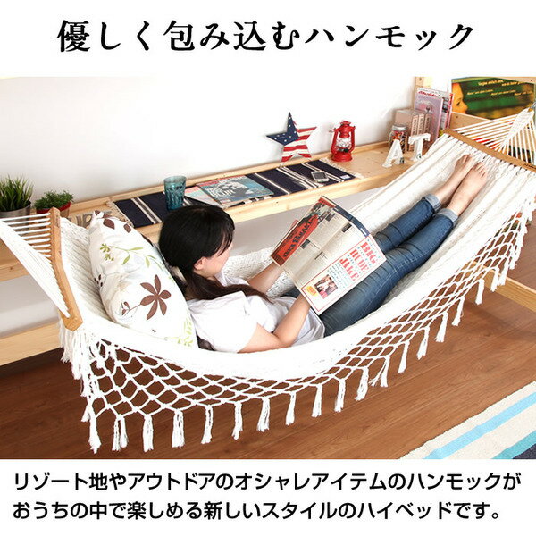 ■商品内容[優しく包み込まれるハンモック]ハンモックでゆらゆらと揺られながら、読書やお昼寝を楽しむ事ができます。リングの位置を変えれば高さ調整が可能です。はしごをヘッド・フットに設置すればフルオープンになります。[まったりとしたくつろぎ空間を演出]ハンモックのサイドには、棚が設置されていてコーヒーを飲みながら、本やタブレットを見る事ができ、くつろぎの空間になります。[安心品質]上段は、すのこ仕様の通気性に優れたシングルベッド。天然木のパイン材を使用した安心の品質です。[天然木について]天然木の特徴でもある節・傷・黒い木目や青い筋状の木目等が入っている部分があります。また、節・木目等は一様ではなく個々により異なります。材料のロットの違いなどにより、板の色合いにも個体差がございます。天然木の風合いとしてお楽しみください。目立つ節や傷等には加工場にて予め必要な補修をしている場合があります。限られた資源を無駄にせず木材を有効活用するよう努めております。そのため、補修跡等がある場合もございますので、ご理解願います。天然木は、保管場所や設置場所の湿度や温度、光の当たり方などの条件により伸縮を繰り返すため、2mm-8mm程度の隙間やサイズの誤差が生じる場合がございます。■商品スペック【外寸】幅107.4×長さ211.6×高さ179cm【内寸】[床面]幅99.6×長さ200cm[床面高]146cm[床面下]136cm(床からサイドフレームまで)[棚]幅205×奥行35×高さ70cm【商品仕様】[材質]・フレーム:天然木パイン材、ラバーウッド(ラッカー塗)・すのこ:天然木パイン材(無塗装)・ハンモック:コットン、ポリエステル、ラバーウッド(ウレタン樹脂塗装)[重量]約66kg[耐荷重]・床面静止耐荷重:150kg・棚静止耐荷重:30kg・ハンモック静止耐荷重:100kg[生産国]ベトナム[備考]お客様組立商品【組立てについて】・本品はお客様にて組立ての作業が必要となります。・商品の組立て開始前に、部材不足・破損がないか必ずご確認ください。【ご注意事項】本商品は、北海道・沖縄・離島への配送はいたしかねます。あらかじめご了承ください。■送料・配送についての注意事項●本商品の出荷目安は【2025年8月下旬より順次出荷】となります。●お取り寄せ商品のため、稀にご注文入れ違い等により欠品・遅延となる場合がございます。●本商品は仕入元より配送となるため、北海道・沖縄・離島への配送はできません。[ HMC-300 ]