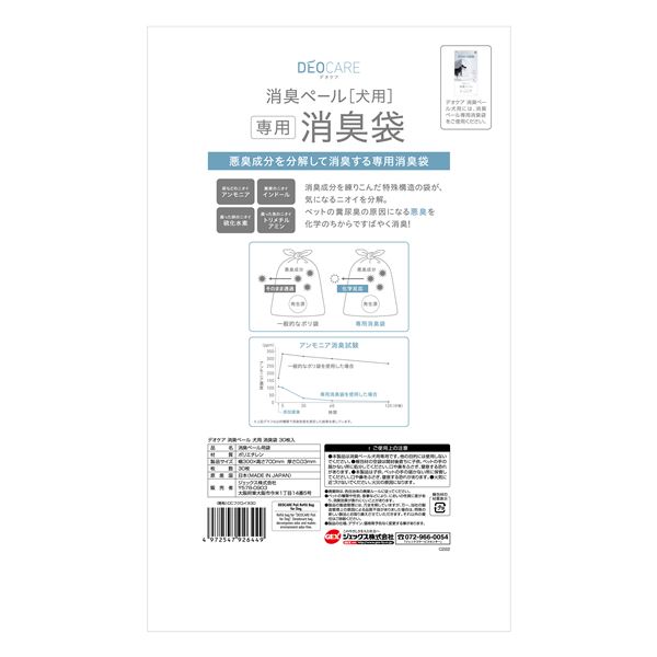 ■商品内容使用済シーツのイヤなニオイを消臭剤を練り込んだ特殊構造で悪臭成分を分解して消臭!心地よい清潔な空間に。<悪臭成分を分解して消臭する専用消臭袋>消臭成分を練りこんだ特殊構造の袋が、気になるニオイを分解。ペットの糞尿臭の原因になる悪臭(尿などのニオイ:アンモニア、糞便のニオイ:インドール、腐った卵のニオイ:硫化水素、腐った魚のニオイ:トリメチルアミン)を化学のちからですばやく消臭!※デオケア消臭ペール犬用にご使用ください。●内容量:30枚(レギュラーシーツ約360枚分/約120日(1日3枚使用した場合))■商品スペック■材質/素材:ポリエチレン■原産国または製造地:日本■商品使用時サイズ:幅300×奥行0.03×高さ700mm■使用方法:デオケア消臭ペール犬用にご使用ください。■諸注意:デオケア消臭ペール犬用には、消臭ペール犬用消臭袋をご使用ください。廃棄時は、各自治体の廃棄ルールに従ってください。【キャンセル・返品について】商品注文後のキャンセル、返品はお断りさせて頂いております。予めご了承下さい。【特記事項】商品パッケージは予告なく変更される場合があり、登録画像と異なることがございます。■送料・配送についての注意事項●本商品の出荷目安は【1 - 5営業日 ※土日・祝除く】となります。●お取り寄せ商品のため、稀にご注文入れ違い等により欠品・遅延となる場合がございます。●本商品は仕入元より配送となるため、沖縄・離島への配送はできません。[ 57470 ]