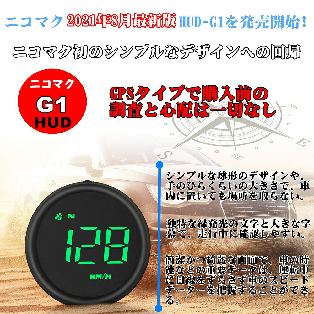 【ニコマク最新版HUD―G1を発売開始!】皆様のおかげてニコマクの初代HUDは大変人気で売っていました!今度こそ、余計な機能を除き、ニコマク初のシンプルなデザインへの回帰します!シンプルな球形のデザインや、手のひらくらいの大きさで、車内に置いても場所を取らない。独特な緑発光の文字と大きな字幕で、走行中に確認しやすい。簡潔かつ綺麗な画面で、車の時速などの重要データは、運転中に目線をずらさず車のスピードデーターを把握することができます。 【GPSタイプ、購入前の調査と心配は一切なし】GPSモードですべての車が対応できます。車速表示、速度超過アラーム、過労運転注意、走行距離などの運転中に欠かせない機能を揃っています。【スピード精度が高い】スピードキャリブレーション機能を追加し、自働車のダッシュボード表示と一致するように調整することができます。(GPS車載速度は衛星信号によって許可されるので、普通は調整する必要はない) 【自動で明るさ調整】自動でスマート!エンジン連動で自動電源オンオフでき、利用は大変便利!また、感光性エレメントや高輝度LEDを採用し、自動明るさ調整機能と連携し、綺麗な表示を実現できます。 【設置簡単】車内のUSBコネクタに挿してダッシュボードに固定するだけ、工具不要1分で設置完了。車内のUSBコネクタの電圧は5Vです。 【日本語取扱説明書付&12月間保証期限】詳しく日本語説明書を付属しています。保証期間はお買い上げ日より12ヶ月間となります。特別な24時間対応サービス:24時間以内対応させていただきますので、商品の詳細・不具合・返品・返金等の件はぜひお気軽にご連絡ください。