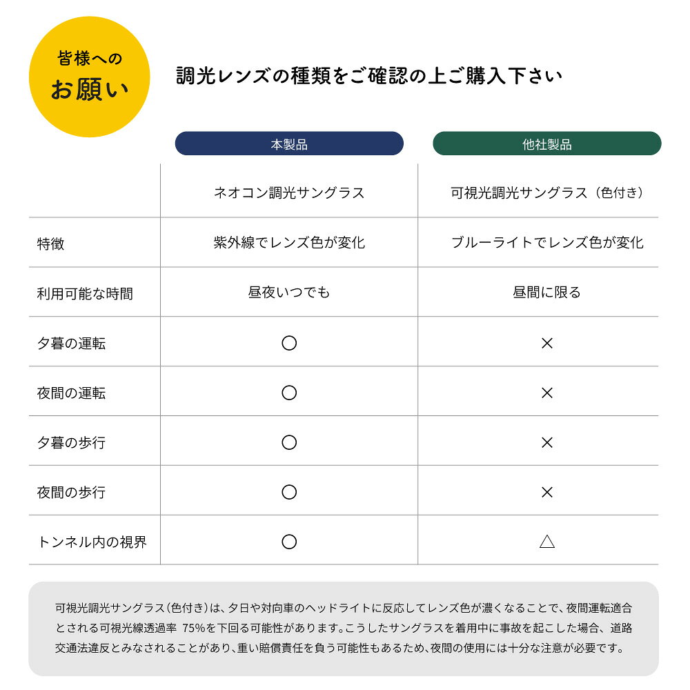 メーカー希望小売価格はメーカーカタログに基づいて掲載しています ■品名:ファッション用グラス ■レンズ枠、テンプルの材質 プラスチック(塗装) ■レンズの材質:プラスチック(コーティング) ■サイズ:フリー(メンズ レディース 男女兼用) ■オーバーグラスとしても使用可能 ■紫外線透過率:0.1%未満 ■可視光線透過率:75%以上 ※調光レンズのため、紫外線が当たることで最低で20%まで減少 ■眼鏡の上からかける場合の眼鏡の横幅:最大140mm 【 眩しさ や 紫外線 から 眼を守る ネオコントラスト 】 ・日中及び夜間の運転での眩しさを低減するサングラス ・登録商標はNeoContrast (ネオコントラスト) ・人間の眼の感度が最も高くまぶしいと感じる黄色い光(イエローライト)を、最大70%以上カット ・これまで無かった非常に明るい視界のサングラス ・視界の明るさを確保しつつ、眩しい光のみをカット ・夜間はネオン、ヘッドライトのまぶしさも軽減 ・まぶしさを抑えることは運転での眼の疲れの低減にも繋がります ・日中は太陽の光、紫外線、室内の窓からの光、蛍光灯、携帯、パソコン、スマホの眩しさも軽減 ・薄い色のため、瞳孔が大きく開かず、目に優しいサングラス ・ネオコントラストの特徴としてh、青 赤 緑 の コントラスト がより鮮明になり、景色が鮮やかに見えます ・40代からの視界に、忘れかけていた子供の頃の鮮やかな景色が蘇ってきます ・「空がこんなに青かった?お花がこんなにきれい!」などの驚きの声が多数 ・眼鏡の街、福井県鯖江市で製造し、お届けいたします 【用途に合わせて】 ・ pc パソコン タブレット スマホ ・眼鏡の上からかける オーバーグラス ・白内障 術後 保護メガネ ・花粉症 保護グラス ゴーグル ・紫外線対策 UVカット用 ・ 夜釣り 夜間 ドライブ ・アイケア 用 グラス 【スポーツに】 ・ ゴルフ ドライブ 野球 テニス ウォーキング サイクリング 【贈り物に】 ・ 10代 20代 30代 40代 50代 60代 ヤング から シニア まで 幅広い年代の方におすすめです。 ・ 誕生日、父の日、母の日、敬老の日のプレゼント におすすめ ・ バレンタインデー、ホワイトデーの 贈り物 やお礼に ・ お中元 お歳暮 クリスマス お年賀の ギフトにも 【イベントに合わせて】 ・ 正月 初詣 新年会 新学期 仕事始め 成人式 お供え ・ 節分 立春 受験 ひな祭り 卒業式 送別会 彼岸の入り 退職 ・ 新生活 お花見 入学式 GW 子供の日 こいのぼり 端午の節句 ・ 梅雨 衣替え 七夕 土用の丑 夏のボーナス 旧盆 十五夜 お彼岸 ・ 防災の日 シルバーウィーク 新学期 ハロウィン ハロウィーン ・ 七五三 勤労感謝の日 大晦日 お年賀■商品名:昼夜兼用 ネオコントラスト 調光サングラス オーバー サングラス ネオコントラストシェード ■品名:ファッション用グラス ■レンズ枠、テンプルの材質 プラスチック(塗装) ■レンズの材質:プラスチック(コーティング) ■サイズ:フリー(メンズ レディース 男女兼用) ■オーバーグラスとしても使用可能 ■紫外線透過率:0.1%未満 ■可視光線透過率:75%以上 ※調光レンズのため、紫外線が当たることで最低で20%まで減少 ■眼鏡の上からかける場合の眼鏡の横幅:最大140mm ※車中では紫外線がカットされ、調光レンズの色の変化は限定的になります。