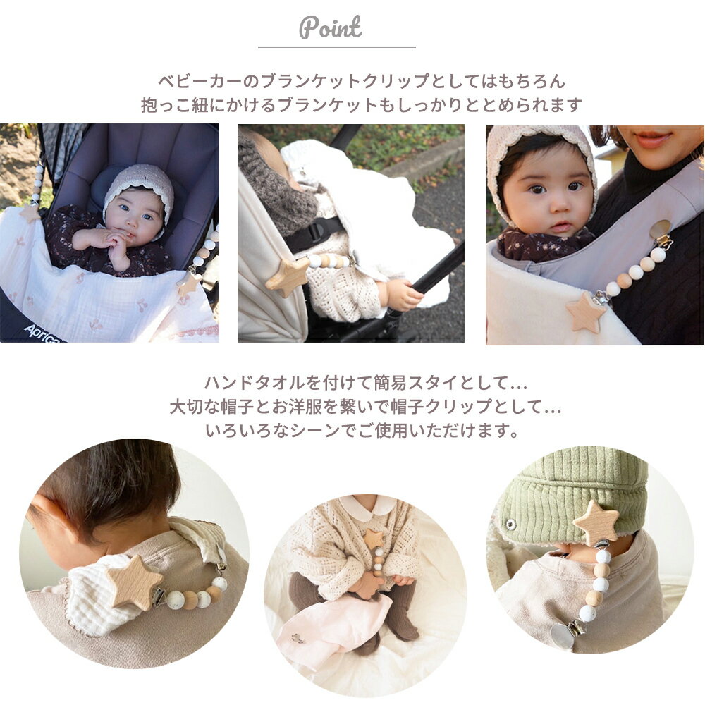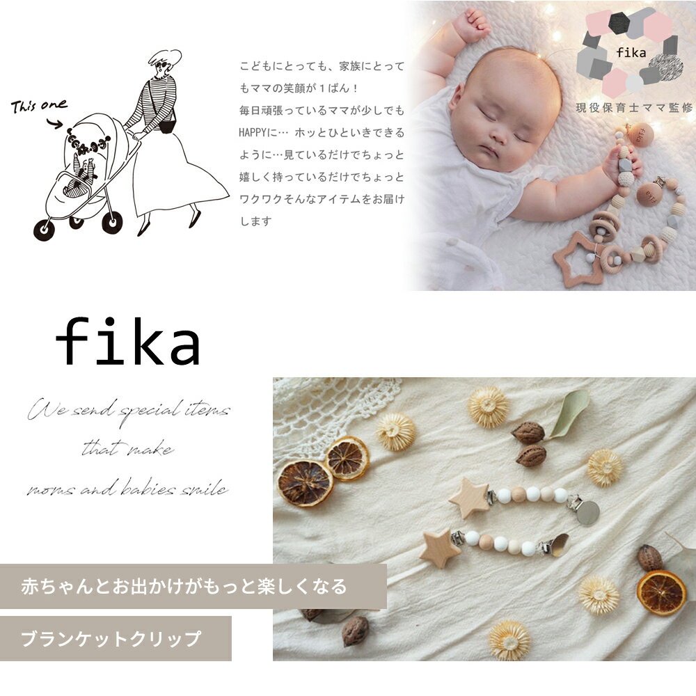 > 商品名 ブランケット クリップ サイズ 全長約16cm 素材 シリコン(BPAフリー・フタル酸エステル等の環境ホルモンを含まない)・天然木(ブナ・メープル等) 商品説明 赤ちゃんとのお出かけが、もっと楽しくなるブランケットクリップ。 fikaからおしゃれでシンプルなデザインがかわいいブランケットクリップの登場です。 ブランケットクリップは、赤ちゃんに優しくかけたブランケットやタオルケットがずり落ちるのを防ぎます。 夏はおくるみなど薄手のタオルをかけて冷房対策に、冬はブランケットを挟んで防寒対策に。 ブランケットクリップの他にも、抱っこ紐にかけるブランケットもしっかりととめられます。 ハンドタオルを付けて簡易スタイとして… 大切な帽子とお洋服を繋いで帽子クリップとして… 脱がせた靴下を挟んだり、赤ちゃんのお気に入りのものを付けておくのにもピッタリのミニサイズです。 シンプルなデザインで、スタイリッシュなベビーカーにもピッタリ。 周りから注目浴びること間違いなし!1年中大活躍の便利な商品です。 プレゼントやギフトにもオススメです。 有料 HOPPLオリジナルラッピングの詳細は コチラ fikaの商品について fika(フィーカ)の商品は保育士ママ監修。 保育士だからこそわかるママの気持ちに寄り添った商品作りをしています。 シリコンは赤ちゃんのお口に直接入るものですので、BPAフリー、フタル酸エステル等の環境ホルモンを含まない安全なものを使用しています。 シリコンは厚生労働省認定の検査機関で検査し、食品衛生基準をクリアしていますので、赤ちゃんに安心してお使いいただけます。 木製パーツは全て無塗装・無着色の天然木製です。 ご使用上の注意 ・クリップは分厚いものを無理に挟むと破損する恐れがありますのでご注意下さい。 ・長期の使用でビーズが外れてしまう危険があります。必ず保護者様の目の届くところでのご使用をお願いいたします。 ・長時間の日焼けにより、ビーズが劣化する可能性がございますので、保管の際にはご注意ください。 ・思わぬ事故の原因となりますので、傷や亀裂が生じた場合には、ご使用を中止してください。 ・本品は玩具ではありませんので、お子様が口に入れないようにご注意ください。 お手入れ方法 ・ご使用後は汚れを拭き取り、十分に乾かしてください。 ・濡れたままで放置するとカビやサビの原因となりますのでご注意ください。 【関連ワード】 ベビーカーグッズ ママ ママ便利グッズ ベビー baby シリコン ベビーギフト 出産祝い 出産準備 人気 かわいい 新生児 0歳 1歳 2歳 男の子 女の子0歳 1歳 2歳ママ便利グッズ