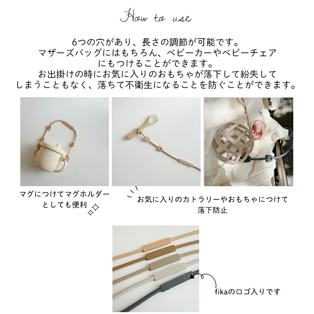 > 商品名 シリコンストラップ サイズ 全長約52cm 素材 シリコン (シリコン商品は20℃から220℃までの耐熱性がありますので、熱に強く、清潔にご使用いただけます) 商品説明 先端に歯固めやおしゃぶり、お気に入りのおもちゃやマグホルダーを付けることのできる シリコン製のストラップです。 ホルダーは、大切なオモチャやおしゃぶり、歯固めがいつでも赤ちゃんの手に取りやすく、落下から守ります。 6つの穴があり、長さの調節が可能です。 マザーズバッグにはもちろん、ベビーカーやベビーチェアなどにもつけることができます。 お出掛けの時にお気に入りのおもちゃが落下して紛失してしまうこともなく、落ちて不衛生にな ることを防ぐことができます。 水洗いができるのでお手入れも簡単です。 シリコンはBPAフリー、フタル酸エステル等の環境ホルモンを含まない安全なものを使用しています。 シリコンは厚生労働省認定の検査機関で検査し、食品衛生基準をクリアしていますので、赤ちゃんに安心してお使いいただけます。 fikaの商品について fika(フィーカ)の商品は保育士ママ監修。 保育士だからこそわかるママの気持ちに寄り添った商品作りをしています。 シリコンは赤ちゃんのお口に直接入るものですので、BPAフリー、フタル酸エステル等の環境ホルモンを含まない安全なものを使用しています。 シリコンは厚生労働省認定の検査機関で検査し、食品衛生基準をクリアしていますので、赤ちゃんに安心してお使いいただけます。 木製パーツは全て無塗装・無着色の天然木製です。 ご使用上の注意 ・シリコンはホコリなどが付着しやすいので、ご使用前にウエットティッシュなどで拭いて下さい。 ・必ず保護者様の目の届くところでのご使用をお願いいたします。 ・思わぬ事故の原因となりますので、傷や亀裂が生じた場合には、ご使用を中止してください。 お手入れ方法 ・水洗い可 ・煮沸消毒可・・・沸騰したお湯に3~5分目安で入れ消毒してください。 ・食洗機の洗浄可 ・薬剤の消毒可・・・哺乳瓶用の薬液を使用することが可能です。 ・電子レンジ消毒・・・専用ケースに入れて消毒してください。各種機種によりお時間を確認してください。 洗浄後は乾いた状態で保管してください。 【関連ワード】 シリコン 歯固め 人気 出産祝い 贈り物 プレゼント お祝い ギフト ラッピング かわいい おしゃれ 誕生日プレゼント 友達 子供 子ども こども キッズ ベビー 赤ちゃん 幼児 乳児 男の子 女の子 孫
