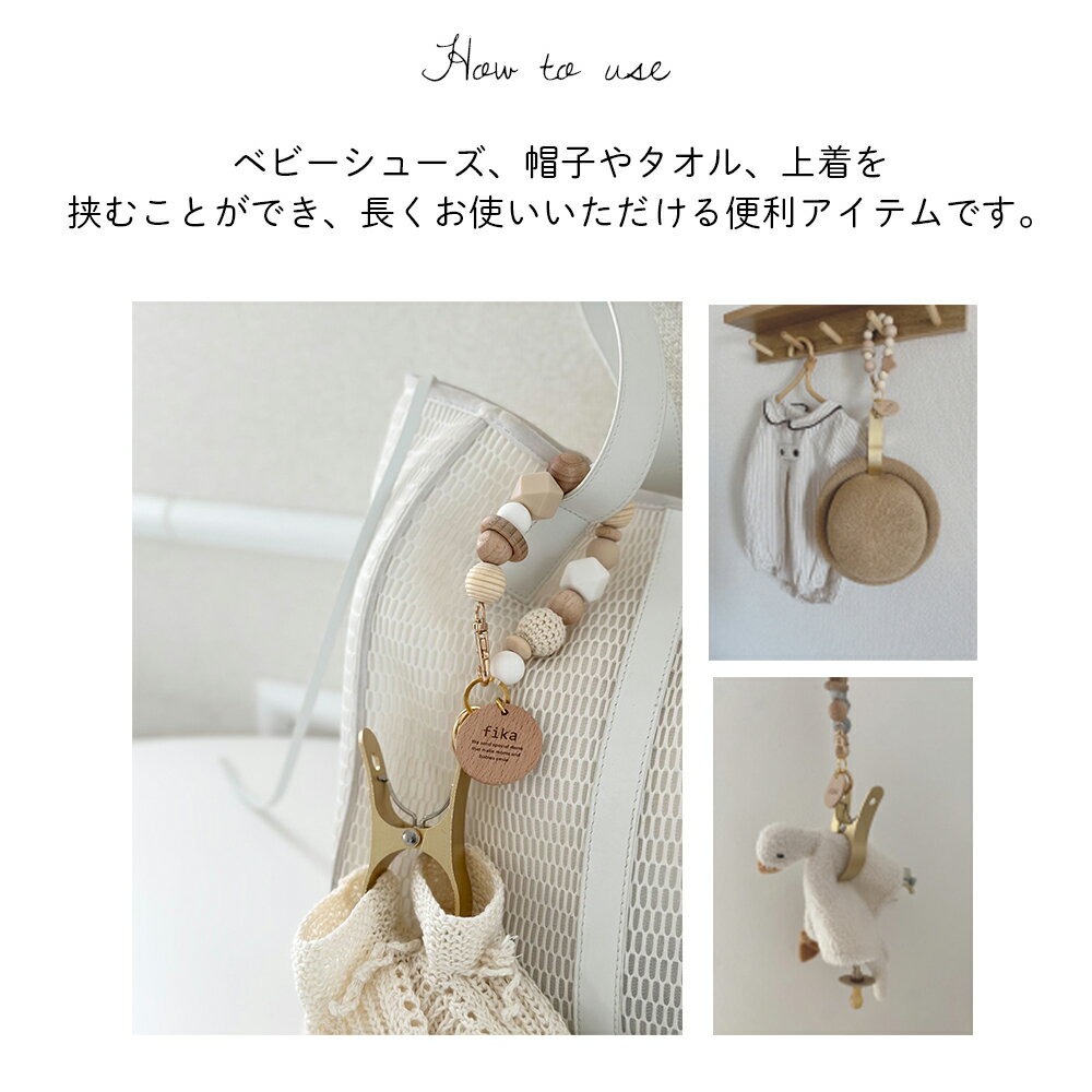 製品仕様 【商品名】 シューズクリップ 【サイズ 】 全長約25cm 【カラー】 dusty pink (ピンクベージュ) cinnamon (グレーベージュ) écru (ホワイト) 【商品詳細】 赤ちゃんとのお出かけにとっても便利なシューズクリップが、大きくリニューアル!! お子様の大切な靴を、なくさないようにワンアクションで保管します。 ベビーシューズを使う前から、帽子やタオル、上着を挟むことができ、長くお使いいただける便利アイテムです。 他の商品とお揃いで使っていただける人気のカラーラインも魅力です。 ■ベビーカーの持ち手部分やサイドのアルミフレームを傷付けない、シリコン素材で取り付けられる形状! ■よりホールド力のある、しっかりとしたクリップ ■プレゼントにもピッタリな、スタイリッシュなパッケージ グリップ部分がデリケートなベビーカーものも多く、大切なベビーカーを傷つけないよう、アルミ部分に付けてもカチャカチャしないよう、当たる部分はシリコンand天然木で、ぐるっと回せるタイプになりました。 リングもついているので、実はクリップをとっても、いろんな使い方が楽しめます! 【fikaの商品について】 fika(フィーカ)の商品は保育士ママ監修。 保育士だからこそわかるママの気持ちに寄り添った商品作りをしています。 シリコンは赤ちゃんのお口に直接入るものですので、BPAフリー、フタル酸エステル等の環境ホルモンを含まない安全なものを使用しています。 シリコンは厚生労働省認定の検査機関で検査し、食品衛生基準をクリアしていますので、赤ちゃんに安心してお使いいただけます。 木製パーツは全て無塗装・無着色の天然木製です。 【ご使用上の注意】 ・シリコンはホコリなどが付着しやすいので、ご使用前にウエットティッシュなどで拭いて下さい。 ・赤ちゃんの力に耐えられるよう注意して作成しておりますが、強い力が加わったり、長期の使用でビーズが外れてしまう危険があります。 必ず保護者様の目の届くところでのご使用をお願いいたします。 ・思わぬ事故の原因となりますので、傷や亀裂が生じた場合には、ご使用を中止してください。 ・ビーズの誤飲を防ぐため、ホルダーには必ず歯固めやおもちゃをつけた状態で保管してください。 ・ケガの危険がありますので、クリップ部分は口に入れないようにご注意ください。 【お手入れ方法 】 ・ご使用後は汚れを拭き取り、十分に乾かしてください。 ・濡れたままで放置するとカビやサビの原因となりますのでご注意ください。