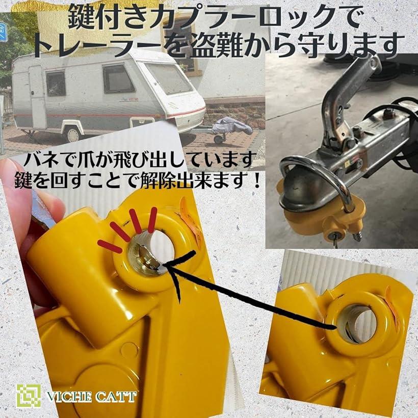 バリエーションコード : 2b4xwi2lrk商品コード2b4xwihyjd商品名トレーラー 盗難防止 牽引フック ヒッチメンバー カプラー ロック 鍵 ヒッチキャリア ヒッチボール ヒッチカーゴ イエローブランドVICHE CATTカラーイエロー・水上スキーやジェッとスキー、モトクロスバイクなど海や山へ遊びに行く際、移動に欠かさせないトレーラーの盗難が心配になること、ないですか?駐車場にある無防備なあなたの大切なトレーラーをこのカプラーロックが盗難からしっかり守りきります。 取付も簡単、扱いやすく、鍵なしでの開錠が構造上難しいため、盗難意欲を欠くことで未然に防止し、万一の際も盗難に至るまでの時間を稼ぐことができるロックです。すぐれた耐久性のため、破壊による被害も防ぐことができ、安心してアクティビティを楽しめます。・耐久性が非常に強い、亜鉛合金素材を採用し、高い耐衝撃性で製造されているため、ハンマーや金属などによる破壊盗難も防御してくれます。このトレーラー盗難防止用カプラーロックは鍵付き仕様。そのため、試行回数によって解除される恐れのある暗証番号式とはちがい、しっかりとトレーラーを盗難から守ることができます。鍵は1商品につき2本付属。製品ごとに鍵の形状が異なり再発行できないので、紛失にはご注意ください。・車と連結する部分をカプラ(カプラー)と呼びますが、そのカプラ部分にはめ込んで固定するタイプの盗難予防用カプラロック。ヒッチボールをかませるカプラ部分に鍵付きカプラーロックを取り付けて使用。これで車から連結を外して保管する際、安心してトレーラーを置いておけます。(1)カプラ部分にボール部分を差し込み、金属バーをロック本体に差し込む (2)キーをねじりながら、金属を押し込み固定 外す時にはキーをねじれば固定用の爪が緩むので、金属バーを抜けばOK。 金属バーに刻まれた凹凸で、しっかり本体に固定されます。・船やジェットスキーで遊んでいる時、駐車場にあるトレーラーは無防備な状態。そういった際に盗難事件などが起きてしまう場合もありますので、ぜひこちらのカプラーロックで盗難防止対策をオススメします。水上スキーなどのマリンスポーツ、モトクロスバイクを運びたい方や、最近人気のキャンプでトレーラーを引きたい。といった方へ、あなたの大切なトレーラーを安心して置いておけ、思う存分アウトドアを楽しむことができます。・サイズ:ボール部分直径47mm(殆どのヒッチ型カプラに対応) ホールドポール有効幅100mm 重量約820gカラー:ブラック イエロー※ 他ネットショップでも併売しているため、ご注文後に在庫切れとなる場合があります。予めご了承ください。※ 品薄または希少等の理由により、参考価格よりも高い価格で販売されている場合があります。ご注文の際には必ず販売価格をご確認ください。※ 沖縄県、離島または一部地域の場合、別途送料の負担をお願いする場合があります。予めご了承ください。※ お使いのモニタにより写真の色が実際の商品の色と異なる場合や、イメージに差異が生じることがあります。予めご了承ください。※ 商品の詳細(カラー・数量・サイズ 等)については、ページ内の商品説明をご確認のうえ、ご注文ください。※ モバイル版・スマホ版ページでは、お使いの端末によっては一部の情報が表示されないことがあります。すべての記載情報をご確認するには、PC版ページをご覧ください。トレーラー盗難防止用カプラーロックのご紹介です。水上スキーやジェッとスキー、モトクロスバイクなど海や山へ遊びに行く際、移動に欠かさせないトレーラーの盗難が心配になること、ないですか?駐車場にある無防備なあなたの大切なトレーラーをこのカプラーロックが盗難からしっかり守りきります。取付も簡単、扱いやすく、鍵なしでの開錠が構造上難しいため、盗難意欲を欠くことで未然に防止し、万一の際も盗難に至るまでの時間を稼ぐことができるロックです。ヒッチボールをかませるカプラ部分に鍵付きカプラーロックを取り付けて使用。これで車から連結を外して保管する際、安心してトレーラーを置いておけます。水上スキーなどのマリンスポーツ、モトクロスバイクを運びたい方や、最近人気のキャンプでトレーラーを引きたい。といった方へ、あなたの大切なトレーラーを安心して置いておけ、思う存分アウトドアを楽しむことができます。鍵は1商品につき2本付属。製品ごとに鍵の形状が異なり再発行できないので、紛失にはご注意ください。車と連結する部分をカプラ(カプラー)と呼びますが、そのカプラ部分にはめ込んで固定するタイプの盗難予防用カプラロック。(1)カプラ部分にボール部分を差し込み、金属バーをロック本体に差し込む(2)キーをねじりながら、金属を押し込み固定外す時にはキーをねじれば固定用の爪が緩むので、金属バーを抜けばOK。金属バーに刻まれた凹凸で、しっかり本体に固定されます。すぐれた耐久性のため、破壊に