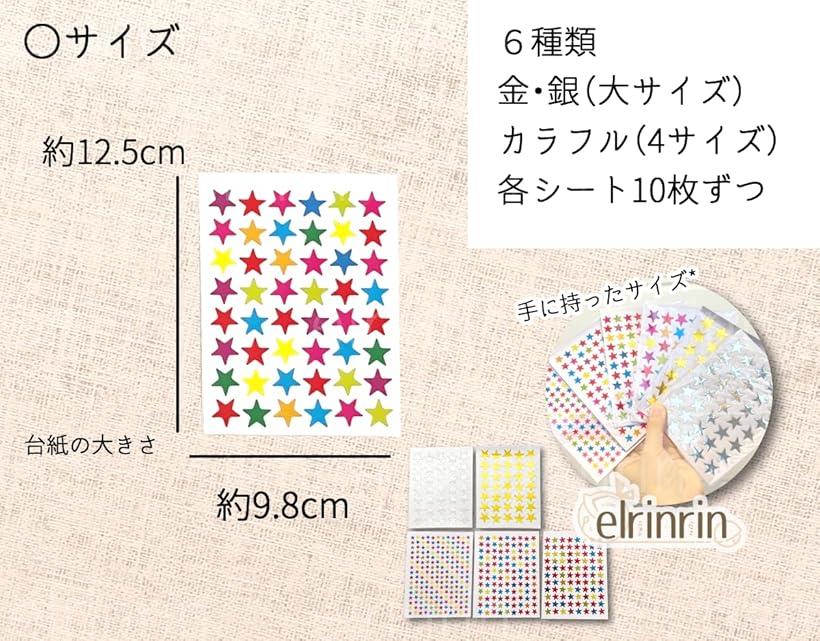 バリエーションコード : 2b2ur9t4dv商品コード2b2urus3fp商品名星シール シール ごほうびシール カラフル 星型 キラキラ 大量 ご褒美ステッカー AセットブランドelrinrinカラーAセット星型のシールセットです。星形シールの数種類が入ったシールセットです。大容量なので、イベントや行事にたくさんお使いいただけます。カラフルな色に加え、金色、銀色の単色、サイズも4種類あるので、用途に合わせて使い分けることができます。※ 他ネットショップでも併売しているため、ご注文後に在庫切れとなる場合があります。予めご了承ください。※ 品薄または希少等の理由により、参考価格よりも高い価格で販売されている場合があります。ご注文の際には必ず販売価格をご確認ください。※ 沖縄県、離島または一部地域の場合、別途送料の負担をお願いする場合があります。予めご了承ください。※ お使いのモニタにより写真の色が実際の商品の色と異なる場合や、イメージに差異が生じることがあります。予めご了承ください。※ 商品の詳細(カラー・数量・サイズ 等)については、ページ内の商品説明をご確認のうえ、ご注文ください。※ モバイル版・スマホ版ページでは、お使いの端末によっては一部の情報が表示されないことがあります。すべての記載情報をご確認するには、PC版ページをご覧ください。*金銀は大サイズのみ*発注時に若干の仕様・見た目の色・サイズ等の変更はありますのでご容赦ください。サイズ: 台紙サイズ 約12.5cmx9.8cm 星サイズ*大(金・銀・カラフル) 約1.6cm/ 中 1.4cm/ 小 約1cm/ 極小 約0.8cm 各10枚入りカラー:カラフル・金・銀