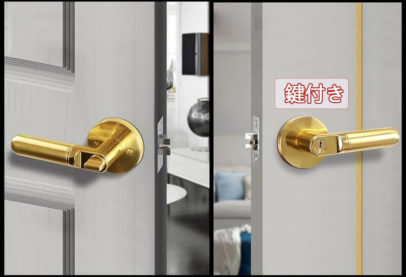 ドアノブ レバーハンドル錠 室内 寝室に適用 厚さ34-54mmのドアに最適 (鍵付き-金)