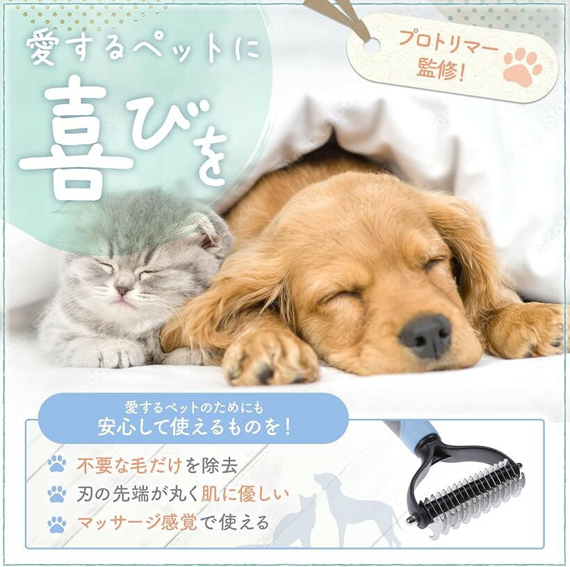 バリエーションコード : 2bjfdx9408商品コード2bjfdx9408商品名ごっそり よく取れる 毛玉・ムダ毛取りブラシプロトリマー監修犬・猫 ペット用品 青 小ブランドPetnerカラー青サイズ等小「ごっそり抜け毛除去」両面刃構造により粗目で毛をときほぐし、毛玉を取り除きます。細目で抜け毛を取り除きます。毛並みの状況によって刃の使い分けができます。「コミュニケーションにも有効」両面とも目が粗く刺激が少ないぶん、マッサージ感覚で使えます。また、日常的に使用することでペットとの絆を深めるコミュニケーションにも最適です。「安心・安全設計」刃の先端は丸くなっており、誤ってペットの皮膚を傷つける心配がないため安心して使用できます。「衛生的・経済的」ブラシごと丸洗いできるタイプなので、常に清潔な状態をキープできます。また、何度でも使えるため長く経済的に使用できます。大サイズ:17x9cm 小サイズ:17x6.5cm※ 他ネットショップでも併売しているため、ご注文後に在庫切れとなる場合があります。予めご了承ください。※ 品薄または希少等の理由により、参考価格よりも高い価格で販売されている場合があります。ご注文の際には必ず販売価格をご確認ください。※ 沖縄県、離島または一部地域の場合、別途送料の負担をお願いする場合があります。予めご了承ください。※ お使いのモニタにより写真の色が実際の商品の色と異なる場合や、イメージに差異が生じることがあります。予めご了承ください。※ 商品の詳細(カラー・数量・サイズ 等)については、ページ内の商品説明をご確認のうえ、ご注文ください。※ モバイル版・スマホ版ページでは、お使いの端末によっては一部の情報が表示されないことがあります。すべての記載情報をご確認するには、PC版ページをご覧ください。プロトリマー監修の犬や猫のための毛玉・ムダ毛取りブラシです。特殊な刃の設計により、簡単に安全に毛玉を取り除けます。刃の先端を丸く設計することでペットの皮膚に優しく、ストレスを与えずに使用できます。ペットの被毛の手入れに悩んでいる方におすすめです。