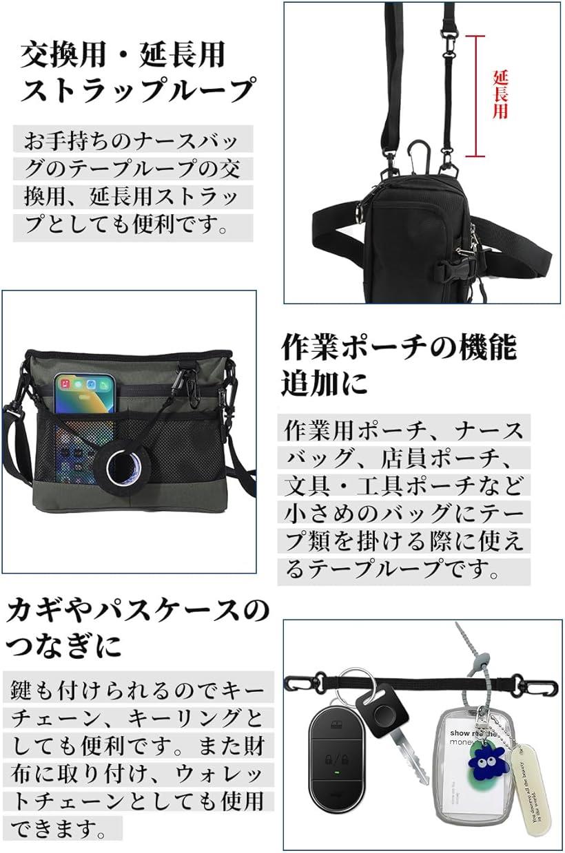 バリエーションコード : 2bjoqxxx8f商品コード2b9x4cxtx3商品名ストラップループ 業務用 作業用 ナスカン仕様 4個セット テープループ バッグ取り付けベルト 手提げ ショートストラップ バッグ ポーチ スマホ ストラップ 交換用 延長用 持ち手ブランドCARRY ALL BEFORE ONEカラーブラック(樹脂フック)サイズ等26cmx4個*作業用ポーチ、 仕事用ポーチ、シザーバッグなどに最適な業務用ストラップループ。(テープ類を掛けるテープループ)お手持ちのカギやパスケースなどのつなぎとしても便利。*「作業ポーチの機能追加に」作業用ポーチ、仕事用ポシェット、ナースバッグ、店員ポーチ、工具バッグなど小さめのバッグに使えるストラップループ。ウエストバッグやポーチに、テープループとして使えます。(ウエストポーチや工具バッグにテープを掛ける紐として、そのバッグの機能を高める商品なので、ファッション性は高くありません。)*「交換用・延長用ストラップループ」お手持ちのナースバッグのテープループの付け替え用、交換用、延長用としても便利です。*「カギやパスケースのつなぎに」鍵も付けられるのでキーチェーン、キーリングとしても便利です。また財布に取り付け、ウォレットチェーンとしても使用できます。*「スマホの落下、紛失防止に」財布やスマホの落下、紛失防止、スリ対策として使用できます。*「簡単ワンタッチ装着」取り付けは簡単にワンタッチで着脱できるナスカンを採用。取り付け場所を選ばず、お好きな箇所に付けできます。ナスカンで簡単にパンツのベルトループに掛けたり、パスケースや鍵に付けたりできます。*「シンプルデザイン」無地でシンプルなデザインだから、スマホポーチ、カラビナポーチ、ベルトポーチ、ミニサコッシュなど様々なお仕事ポーチ・バッグに使えます。*「使い方は様々」定期入れ、お財布などに付け、バッグ内のDカンにつなげて収納。トートバッグ、リュックなどにミニポーチやスマホポーチを取り付けるストラップとしても使えます。その他、小型バッグ、財布などの持ち手、長さの足りないストラップの延長用としてや、ハンドメイドやDIY用のオリジナル商品作りの素材としても適しています。*「商品詳細」素材:ポリプロピレン(PP) サイズ; ベルト幅 1cm ベルト長さ(金具含む) 26cm、32cm 生地の伸縮性:なし 長さ調整:不可(作業ポーチ、作業バッグ用なので、ファッションアクササリーとしては不向きです。※ 他ネットショップでも併売しているため、ご注文後に在庫切れとなる場合があります。予めご了承ください。※ 品薄または希少等の理由により、参考価格よりも高い価格で販売されている場合があります。ご注文の際には必ず販売価格をご確認ください。※ 沖縄県、離島または一部地域の場合、別途送料の負担をお願いする場合があります。予めご了承ください。※ お使いのモニタにより写真の色が実際の商品の色と異なる場合や、イメージに差異が生じることがあります。予めご了承ください。※ 商品の詳細(カラー・数量・サイズ 等)については、ページ内の商品説明をご確認のうえ、ご注文ください。※ モバイル版・スマホ版ページでは、お使いの端末によっては一部の情報が表示されないことがあります。すべての記載情報をご確認するには、PC版ページをご覧ください。