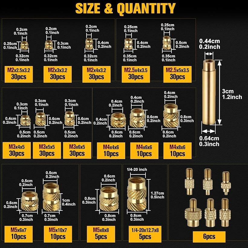 【楽天ランキング1位入賞】互換品 インサートナット セット 307個セット M2 M2.5 M3 M4 M5 M6 1/4-20 埋め込みナット ねじ切りインサートアソートキット プラスチックセット用ネジ切りインサート (イエロー)