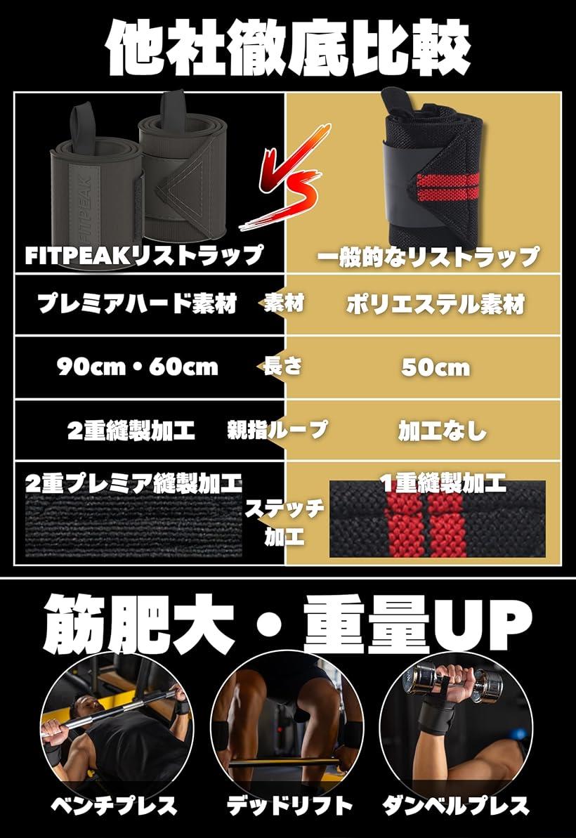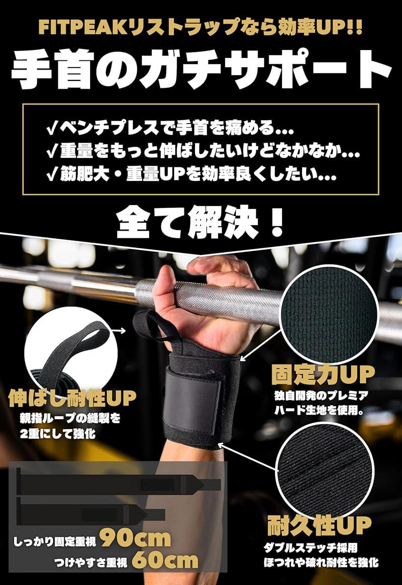 バリエーションコード : 2bu8kr4dju商品コード2b9v4cwf3n商品名リストラップ 筋トレ独自開発の極硬生地で手首サポートウェイトトレーニング 手首 サポーター ベンチプレスブランドFITPEAKカラーピンクサイズ等60cm「重量UP・筋肥大効率UP」FITPEAKリストラップは筋トレでしっかり固定することに重きを置いた独自開発の極硬生地を採用. 開発者自身の筋トレの経験から、既存のリストラップのサポート力に不満があり、開発しました。より重量UP・筋肥大効率UPのために、1kgでも1レップでもより多くトレーニングができるような仕様にしました。「巻きやすい60cm・超固定90cm」あなたはどっち?FITPEAKリストラップは2種類の長さがあり、巻きやすさ重視の60cmタイプと超固定タイプの90cmタイプをご用意しております。目安: 片手重量50kg以下>60cmタイプ、片手重量51kg以上>90cmタイプ。女性や初心者、中級者の方であれば、60cmタイプで十分です。さらに、競技レベルで上を目指したい方、手首の固定を強化したい方は90cmをお勧めします。「ベンチプレス5~7kg重量UP.」最新ChatGPT o1にてベンチプレス100kgにて、リストラップなし、FITPEAKリストラップでシュミレーションした結果105~107kgまでUPしました。(男性70kg、トレ歴5年、FITPEAK製品を使用して仮定)。より高重量、より筋肥大を求める方は、リストラップを活用ください。*あくまでもシュミレーションになりますので、実際とは異なる場合がございます。「現役ボディビルダー兼パーソナルトレーナー推奨」トレーニング歴8年の企画、開発者に加え、開発や製品試作段階から現役のボディビルダー、パーソナルトレーナーに入っていただき、競技レベルのリストラップを作成しました。「商品詳細」素材: ポリエステル繊維&伸縮ラテックス混合生地(極硬生地), カラー: ブラック、イエロー、グリーン、ピンク, 長さ: 90cmタイプ(90x7.5x0.5cm)、60cmタイプ(60x7.5x0.5cm)※ 他ネットショップでも併売しているため、ご注文後に在庫切れとなる場合があります。予めご了承ください。※ 品薄または希少等の理由により、参考価格よりも高い価格で販売されている場合があります。ご注文の際には必ず販売価格をご確認ください。※ 沖縄県、離島または一部地域の場合、別途送料の負担をお願いする場合があります。予めご了承ください。※ お使いのモニタにより写真の色が実際の商品の色と異なる場合や、イメージに差異が生じることがあります。予めご了承ください。※ 商品の詳細(カラー・数量・サイズ 等)については、ページ内の商品説明をご確認のうえ、ご注文ください。※ モバイル版・スマホ版ページでは、お使いの端末によっては一部の情報が表示されないことがあります。すべての記載情報をご確認するには、PC版ページをご覧ください。