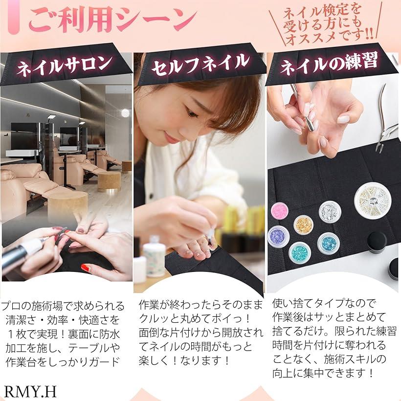 バリエーションコード : 2bux6w4jp6商品コード2bux6w4jp6商品名ネイルペーパーシート 防水 ネイルマット 使い捨て ネイル施術マット サロン用 机保護 ネイル検定 グッズブランドRMY.Hカラーブラック25枚「製品概要」高品質なネイルペーパーシートは、ネイルアートに立体感や華やかさをプラスするアイテム。プロのネイリストからセルフネイルを楽しむ方まで、幅広く使えます。ネイル検定も日常アートも、この一枚でOK。「製品の強み」サロンワークやネイル検定時、衛生面を重視する施術者に安心。施術ごとに新しいシートに交換できます。ネイリスト御用達のプロ品質でペラペラではなくしっかりした厚みで破れにくく施術中の安心感がい品質です。試験本番もサロンワークも。防水マットで机を守る、新習慣。。「サイズ」34cmx45cm 25枚セット、50枚セット※ 他ネットショップでも併売しているため、ご注文後に在庫切れとなる場合があります。予めご了承ください。※ 品薄または希少等の理由により、参考価格よりも高い価格で販売されている場合があります。ご注文の際には必ず販売価格をご確認ください。※ 沖縄県、離島または一部地域の場合、別途送料の負担をお願いする場合があります。予めご了承ください。※ お使いのモニタにより写真の色が実際の商品の色と異なる場合や、イメージに差異が生じることがあります。予めご了承ください。※ 商品の詳細(カラー・数量・サイズ 等)については、ページ内の商品説明をご確認のうえ、ご注文ください。※ モバイル版・スマホ版ページでは、お使いの端末によっては一部の情報が表示されないことがあります。すべての記載情報をご確認するには、PC版ページをご覧ください。ネイル施術中の机汚れや水濡れ、削りカスの片付けに悩んでいませんか?RMY.Hのネイルペーパーシートは、防水仕様で液体やダストをしっかりガード。使い捨てタイプだから、サロンや自宅ネイル後の片付けがぐっと時短に。黒色で汚れが目立ちにくく、清潔感を保ちながら作業効率もアップ。ネイル検定や出張施術、イベントなど様々なシーンで活躍します。衛生的でスマートな施術環境を、この一枚から始めませんか? 「防水&衛生的」液体やダストから机を守る防水ネイルペーパーシート。施術後の清掃も簡単で、衛生管理にこだわる方に最適。