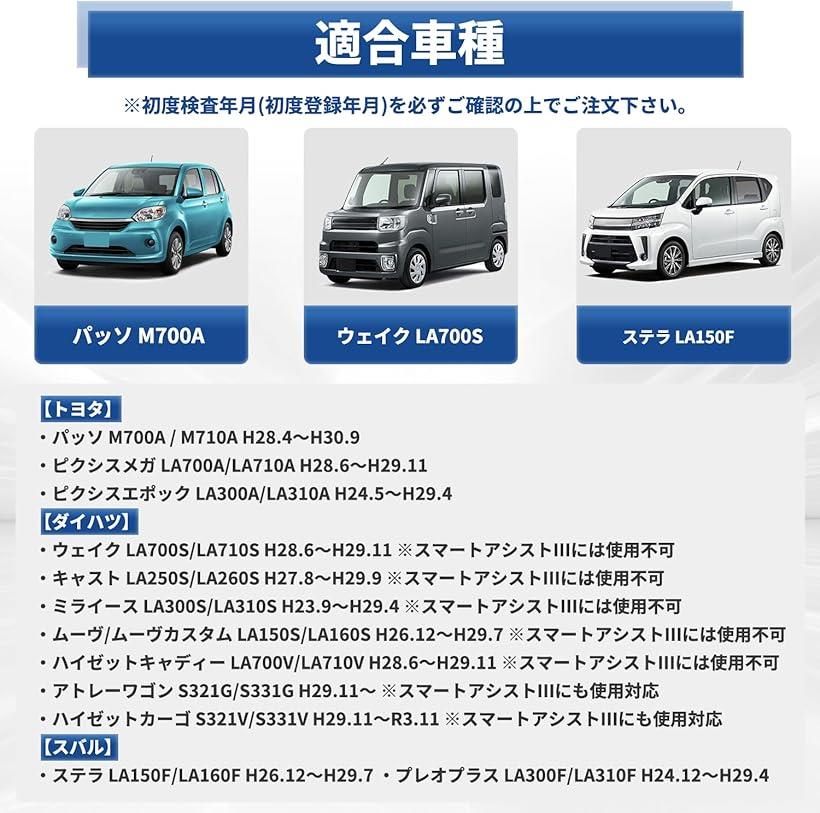 バリエーションコード : 2bucfodhjt商品コード2bucfodhjt商品名互換品 アイドリングストップ キャンセラー ダイハツ 対応 S321V S331V ハイゼットカーゴ 平成29/11~令和3.11 カプラーオン取付 アイドリングストップ自動オフキットブランドVlookee「アイドリングストップ キャンセラー 適合車種」・ダイハツ ムーヴ/ムーヴカスタム H26.12 ~29.7(LA150S/LA160S)・ダイハツ アトレーフゴン H29.11~ R3.11 (S321G/s331G)・スバル ステラ H26.12 ~ 29.7 (LA150F/LA160F)・ダイハツ ハイゼットキャディ H28.6~29.11(LA700V/LA710V)・ダイハツ ハイゼットカーゴ H29.11~ R3.11(S321V/s331V)[スマートアシストIIIにも使用対応]・スバル プレオプラス H24.12 ~ 29.4 (LA300F/LA310F)*初度検査年月(初度登録年月)を必ずご確認の上でご注文下さい。*リヤパーキングセンサーOFFスイッチが無い車輛には取付出来ません。「セット内容」アイドリングストップキャンセラー 本体x1、プラスチックリムーバー(ヘラ)x1。サイズ(mm)、配線(カプラー接続)。「特徴」アイドリングストップ機能を一度OFFにすると継続的にOFFの状態を持続することが可能です。アイドリングストップをキャンセルすることにより…*走り出しのレスポンスが向上します*バッテリーの負荷を軽減します*エンジン始動時に使用されるセルモーターの寿命延長します*エンジン始動時の振動で負荷のかかるゴム部品の劣化を抑える効果があります。「カプラーオンで取付簡単です」自動でアイドリングストップをOFFにするアイドリングストップキャンセラーです。面倒な設定は一切不要です、スイッチ裏のコネクターに取付て完了。エンジンをかけるたびにアイドリングストップを手動で行う必要がありません。エアコンの効き具合やエンジンレスポンスの低下を抑えて快適運転.「簡単操作 ON↔OFF切替」いつでも好きな時にスイッチで機能切替が可能、純正復帰 ワンタッチ。ポチっとボタン長押し5秒でアッと言う間に純正復帰。*エンジン停止前のアイドリングストップ状態を記憶する機能は御座いません。*エンジン停止後に再始動する場合は10秒以上経過後に行って下さい。※ 他ネットショップでも併売しているため、ご注文後に在庫切れとなる場合があります。予めご了承ください。※ 品薄または希少等の理由により、参考価格よりも高い価格で販売されている場合があります。ご注文の際には必ず販売価格をご確認ください。※ 沖縄県、離島または一部地域の場合、別途送料の負担をお願いする場合があります。予めご了承ください。※ お使いのモニタにより写真の色が実際の商品の色と異なる場合や、イメージに差異が生じることがあります。予めご了承ください。※ 商品の詳細(カラー・数量・サイズ 等)については、ページ内の商品説明をご確認のうえ、ご注文ください。※ モバイル版・スマホ版ページでは、お使いの端末によっては一部の情報が表示されないことがあります。すべての記載情報をご確認するには、PC版ページをご覧ください。