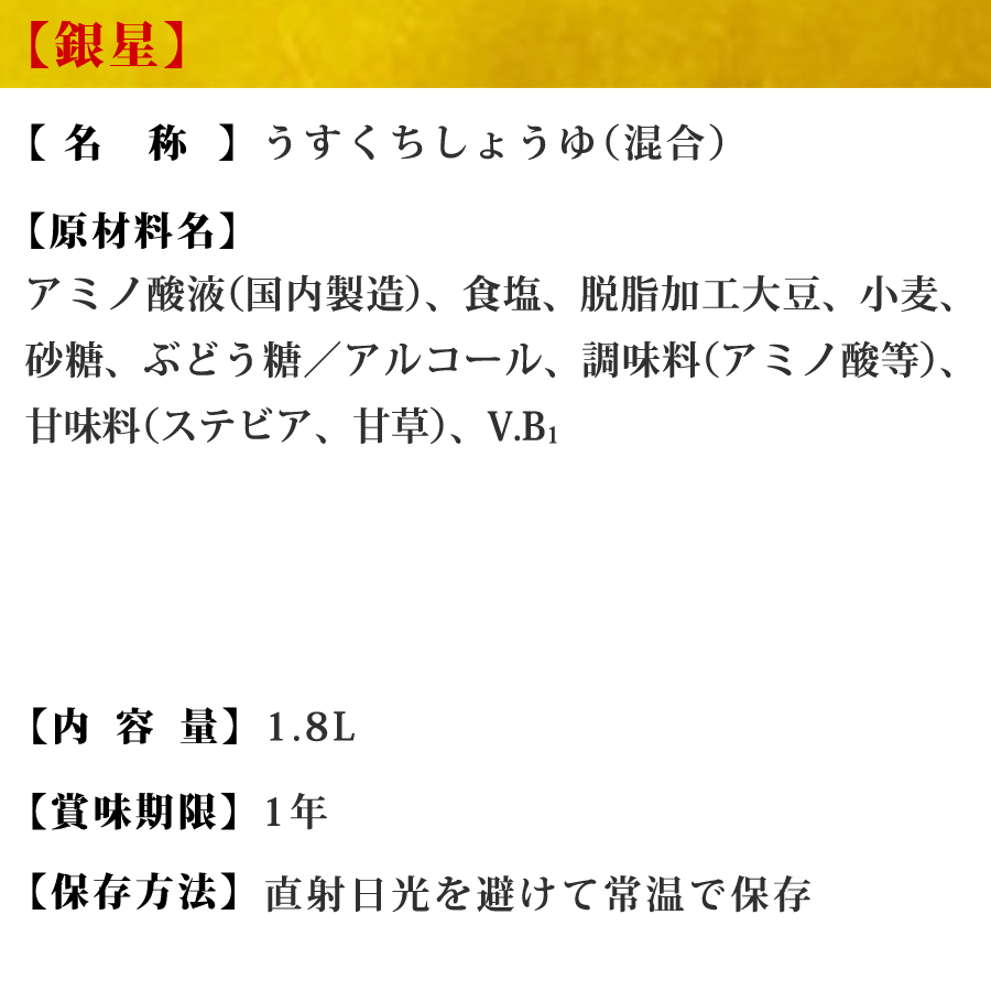 業務用 薄口醤油【プロ御用達】≪九州うすくち醤油 『銀星』 1.8L≫冠名輝く!昔ながらの伝統受け継ぐ逸品【保存料不使用】【九州醤油】【薄口しょうゆ】【創業明治!九州・熊本の老舗醤油屋ホシサン】