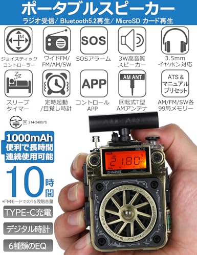 【送料無料】ZHIWHIS Bluetoothスピーカー BCLラジオ FM AM SW T型アンテナ付き/SOSアラーム/APPコントロール/重低音/MicroSDカード対応/10時間連続再生/タイマー/USB-C充電式/技適取得済 コンパクト 防災アウトドア2025新登場ZWS-777