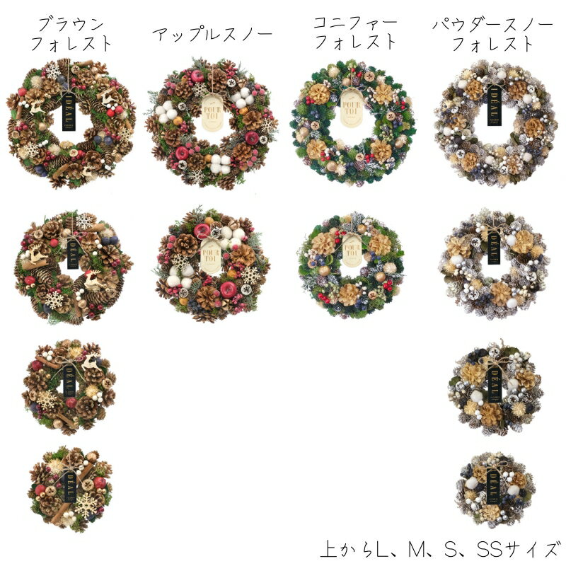 クリスマス木製ピックをリースおひとつにつき1本プレゼント♪ (ピックのデザインはお任せください) 【商品説明】 冬の森をイメージしたナチュラルなリース。 ※Sサイズ、SSサイズはブラウンフォレスト、パウダースノーフォレストのみ。 ■商品サイズ Lサイズ:直径約33cm Mサイズ:直径約25cm Sサイズ:直径約20cm SSサイズ:直径約16cm ■材質 天然素材・発泡スチロール・プラスチック・綿・木・紙など ■備考 中身が見えるボックス入り 【関連商品】 LEDフェアリーライト20球/2個セット 【注意点】 クリスマス前後は荷物の増加や天候により運送便が大変混雑いたします。 配達に遅延が発生する場合がありますので予めご了承ください。 沖縄・離島へのお届けは別途1100円(税込)がかかります。 ご注文後こちらで追加させていただだきますので、予めご了承ください。 クリスマスリース Xmas Christmas ドライリース ナチュラルリース 北欧デザイン インテリア 雑貨 玄関飾り 壁掛け 装飾 クリスマスプレゼント 誕生日 プレゼント 記念日 ギフト お祝い 造花 フラワーアレンジメント 木の実 天然素材 クリスマス Christmas ホリデー リース インテリア 壁飾り 天然素材 ドライフラワー プリザーブドフラワー 大きいサイズ 小さいサイズ 選べる ナチュラル 華やか 店舗 装飾 ドア飾り ゴージャス Lサイズ Mサイズ
