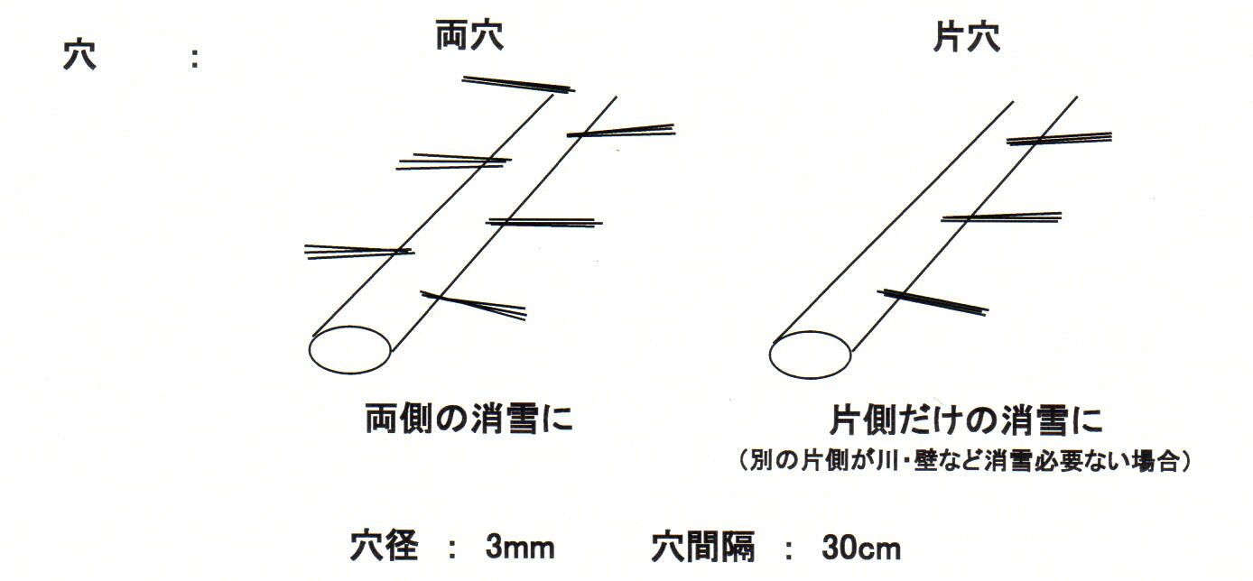 送水ホースをベースに、穴を開け、消雪用に加工したホース。 千鳥両穴加工 ・穴径:3mm ・穴ピッチ:300mm 特長 ●継ぎ手を使わずに長距離の送・排水が可能です。 ●柔軟で屈曲性に富んでいるため、折りたたみができ、格納のスペースをとりません。 使い方 ●消火栓バルブ・ポンプの蛇口に差し込み、バンドで締めるだけ。 用途 ●消雪用ホース。 使用温度範囲:0℃〜35℃ 色:ダークブルー 業務用消雪ホース。井戸水などポンプでくみ上げて使用。 駐車場、通路などの消雪に。 >その他のホース