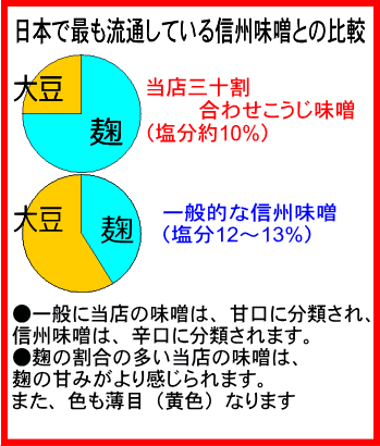 無添加・生味噌ですので発酵により色が濃く変化したり、生じるガスで袋が膨らむことがあります。風味を保つためにも冷蔵庫での保存をおすすめします。 冷蔵庫内の低温でも、じっくりと発酵がすすみます。この微妙な味や風味の変化が、飽きのこない味の理由の一つです。 味噌に関する食品の表示 名称 調合味噌(三十割合わこうじ味噌) ※米こうじと麦こうじを同時に仕込んだ「合わせ」味噌です。法令により合わせ味噌は、「調合みそ」と表示することが定められています。 原材料 麦・米・大豆・食塩 (国産材料100%使用) 保存方法 0〜10℃以下で保存(要冷蔵) 賞味期限 蔵出しから4ヶ月 内容量 750g×6袋 製造者 平田屋糀店 平田計 味噌の風味の目安 辛い← ・ →甘い −−−−−●−− こうじ歩合 30割 ※割合が高いと甘口になります 塩分 約10% ※少ないと甘口になります 形状 粒 ※米や大豆の粒が残ってます 色味 黄色