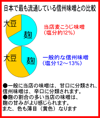 ◆お詫び◆ 現在、北海道・沖縄一部離島等への発送は行っておりません。(運送に要する日数が多いため) 味噌に関する食品の表示 名称 麦味噌 原材料 麦こうじ・大豆・食塩 (国産材料100%使用) 保存方法 0〜10℃以下で保存(要冷蔵) 賞味期限 蔵出しから4ヶ月 内容量 750g 製造者 平田屋糀店 平田計 備考 無添加・生味噌ですので発酵により色が濃く変化したり、生じるガスで袋が膨らむことがあります。風味を保つためにも冷蔵庫での保存をおすすめします。 冷蔵庫内の低温でも、じっくりと発酵がすすみます。この微妙な味や風味の変化が、飽きのこない味の理由の一つです。 味噌の風味の目安 辛い← ・ →甘い −−●−−−−−− こうじ歩合 約15割 ※割合が高いと甘口になります 塩分 約12% ※少ないと甘口になります 形状 粒 ※米や大豆の粒が残ってます 色味 濃い黄色 単品はこちらから