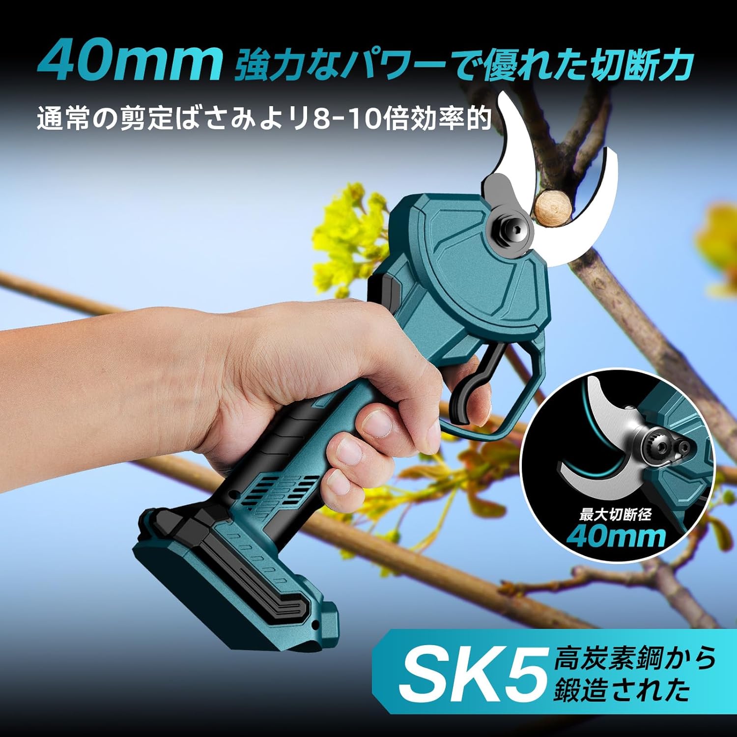 【高枝切りの延長ポールと接続可能】:改善点: 1.旧商品に比べ、ナイフサイズが 40mm になり、最大切断径は 40mm に達します。強力なパワーを備えており、直径 40mm 以内の木を損傷することなく簡単に切断できます。電動剪定ばさみは、従来の手動剪定よりも 10 倍の効率で機能します。改善点2.本製品は最新版です。伸縮式延長ポールと接続可能で、高枝切りが簡単に実現できます。 【ブラシレスモーター採用した電動バサミ】:ブラシレスモーターを採用しており、超強力な動力を提供します。また、モーターには過電流保護機能が備わっており、高効率かつ安全な作業をサポートできます。 【SK5 ブレード&ナイフサイズ変換可能】:このコードレス剪定鋏は SK5高炭素鋼から鍛造され、湾曲したデザインと組み合わされることで、木の枝を滑らかかつきれいに切断できます。ナイフサイズには 10mm、15mm、25mm、40mm の 4 つのモードがあり、初回起動時は 40mmの大きな剪定径で設定されており、電源ボタンを押すだけで、モードを切り替えることができます。※注:1.引き金と電源ボタンを同時に押さないでください。2.モードを切り替える際には、引き金を引かず、電源ボタンのみを押してください。 【LED ディスプレイ搭載&人間工学デザイン】:本製品には LED ディスプレイを搭載しており、バッテリー残量とカット数をディスプレイが明瞭に表示します。※電源スイッチをオフにした後、再度起動すると、切削カウントがゼロにリセットされ、新たなカウントが開始されます。ポータブルかつ滑り止めのハンドヘルドデザインにより、長時間の作業もしやすく、また関節炎の方でも簡単にご使用いただけます。 【2 個バッテリー付きとマキタの 18V バッテリー通用】:2 個のリチウムイオンバッテリーが付属しているため、十分な作業が可能です。電源コードを接続することなく充電して使用できます。使用場所の制限がなく、作業中に線を引っかける心配もありません。それに、本製品の本体はマキタの 18V リチウムイオンバッテリー BL1820b、BL1830b、BL1840b、BL1850b にも対応しています。 【広い適用範囲&品質保証】:この電気剪定ばさみは、あらゆる種類の庭園、公園、農場、大規模な牧草地、果樹園、温室などで幅広く活用できます。ブドウ、桜、リンゴの木などの枝を切断することができます。商品を出荷する前には必ず全数検品しますが、もしお客様に届いた商品に初期不良があったり、箱が潰れていたり、付属品が破損していたりする場合は、商品交換を迅速に対応いたします。 【注意事項】: ・当店の商品は全て国内から配送されます。 ・国内配送の商品は国内でのお買い物と同じく消費税が発生いたします。関税はかかりません。 *色がある場合、モニターの発色の具合によって実際のものと色が異なる場合がある。