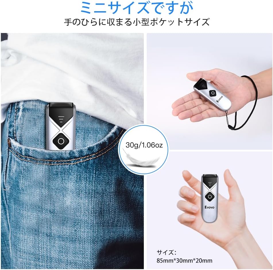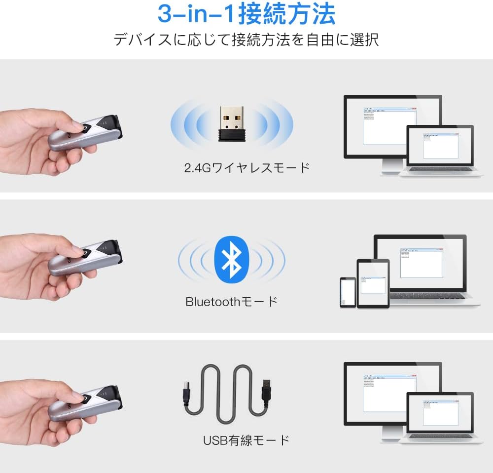 > 【手のひらに収まる小型ポケットサイズ】:超薄型&超軽量コンパクト設計により、バーコードリーダーは場所を取らず、ポケットに入れてハンズフリー操作が可能で、作業効率を大幅に向上させます。 【データ伝送方式3種類&有線無線両方対応】:Eyoyo バーコードスキャナーは、2.4Gワイヤレス・Bluetooth・USB有線の3種類の接続をサポートし、デバイスに応じて接続方法を自由に選択できます。USBケーブルを使い、USBポートに差し込むだけでご利用いただけます。専用のドライバーも必要ありません。ワイヤレスをご利用の場合、2.4GとBluetoothの2方式から選択でき、ケーブルから開放されるワイヤレスの利便性を手軽に実現できます。Windows XP/Win7/Win8/Win10/Win11/Android/iOS に対応しています。 【三つのスキャン読み取り方式】:読み取りデータは即時送信可能で、遠距離でスキャンしたコードをパソコンに一括アップロードできます。スキャン方式はトリガーモード、連続スキャンモード、自動検知モードから選択可能です。さらに接頭辞や接尾辞の編集、バーコードの一部隠蔽、大文字/小文字固定などの設定が可能で、ニーズに合わせてカスタマイズできます。スーパーマーケット、オフィス、化粧品店、小売業、郵便業、図書館、学校、倉庫など幅広い分野でご利用いただけます。 【強い互換性&超長時間スキャン対応】:Eyoyo ミニワイヤレスバーコードリーダーは、iPhone/iPad/スマートフォン/タブレット/PCと接続可能で、Windows XP/7/8/10、Mac OS、Linux、Windows Mobileなど幅広いOSに対応しています。450mAhの大容量充電式バッテリーを搭載しており、満充電時には最大8時間の連続ハンズフリースキャンが可能。これにより業務効率の大幅な向上が期待できます。 【1D/2D/QRコード対応 バーコードスキャナー】:当バーコードスキャナーは一般的な1次元バーコードに加え、2次元コードやQRコードにも完全対応。紙に印刷されたバーコードだけでなく、スマートフォンやタブレットの液晶画面に表示されたコードも確実に読み取ります。 【対応コード】:2D コード:QR Code、Data Matrix 、PDF417、Aztec code、Hanxin、Micro PDF417。1D コード:Codabar、Code 11、Code93、MSI、Code 128、UCC / EAN-128、Code 39、EAN-8、EAN-13、UPC-A、ISBN、Industrial 25、Interleaved 25、Standard25。 【品質保証】:本製品は 1 年間の品質保証を提供しています。ご使用中にご不明な点がある場合、お気軽にご連絡ください。弊社は営業時間の2 時間以内にご返答いたします。お客様の問題を適切に解決するために最善を尽くします。お問い合わせ方法:「注文履歴」-「出品者に連絡」からお気軽にお問い合わせください。 【注意事項】: ・当店の商品は全て国内から配送されます。 ・国内配送の商品は国内でのお買い物と同じく消費税が発生いたします。関税はかかりません。 *色がある場合、モニターの発色の具合によって実際のものと色が異なる場合がある。