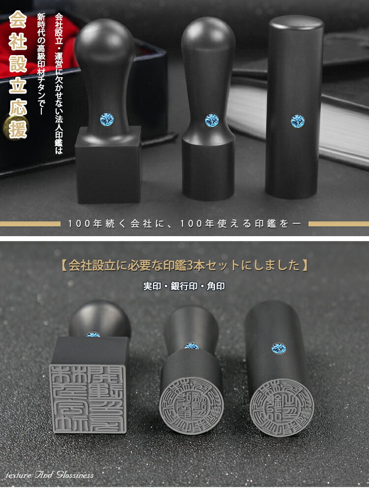 【黒チタン】チタン法人印鑑 3本セット 会社印 印鑑セット 送料無料 10年保証 国産チタン ★ブラスト黒チタン3本セット 実印[天丸]18.0mm+銀行印[寸胴]16.5mm+角印21.0/24.0mmMQL法人3本セット用印鑑ケース[天丸・角印通用] 宅配便