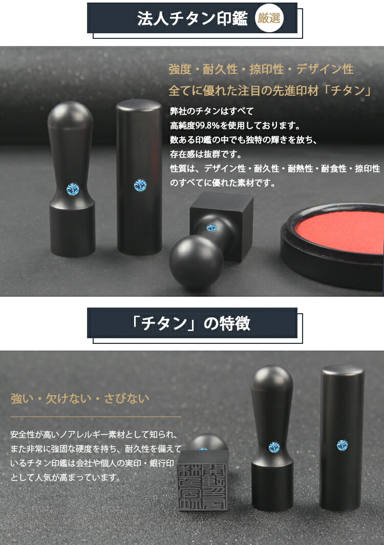 商品説明 最大彫刻文字数 実印(18mm) 外枠:漢字・かな17文字 外枠:英数字18文字 内枠:漢字・かな6文字 内枠:英数字7文字 銀行印(16.5mm) 外枠:漢字・かな16文字 外枠:英数字17文字 内枠:漢字・かな6文字 内枠:英数字7文字 角印(21mm) 漢字・かな:20〜22文字 英数字: 26〜28文字 ※文字により異なります。 ※最大文字数以上もご相談ください。 ※何文字でも同じ金額です。 彫刻内容 実印(代表者印) 外枠:普通は会社名です。 内枠: ●株式会社、有限会社は、「代表取締役印」「取締役印」 ●合資会社、合名会社、個人事業主、各種任意団体は「代表者印」 ●その他の役職印も自由におつくりできます。 例: 会長之印 / 所長之印 / 組合長印 / 支社長印 支店長印 / 理事長印 / 事業部長之印 / 専務取締役印 代表之印 / 本部長印 / 常務取締役印 / 事業部長之印 銀行印 外枠:普通は会社名です。 内枠:『銀行之印』が入ります。 角印 「会社や組織・団体の名称等」 「会社名称と、営業所名や役職名等」に 「之」 「之印」と文字を入れてバランスをとり彫刻します。 <例> ・株式会社○○○印 ・○○○株式会社 ・○○○株式会社△△△営業所長之印 ・○○○デザイン事務所之印 ・司法書士○○○○之印 と文字数によって3行〜5行に分けて収めるのが一般的です。 保証 10年保証 印影確認 可能。書体、太さ、バランスなどのご変更希望も承ります。何回も無料です! 配達 宅配便にてお届けします。