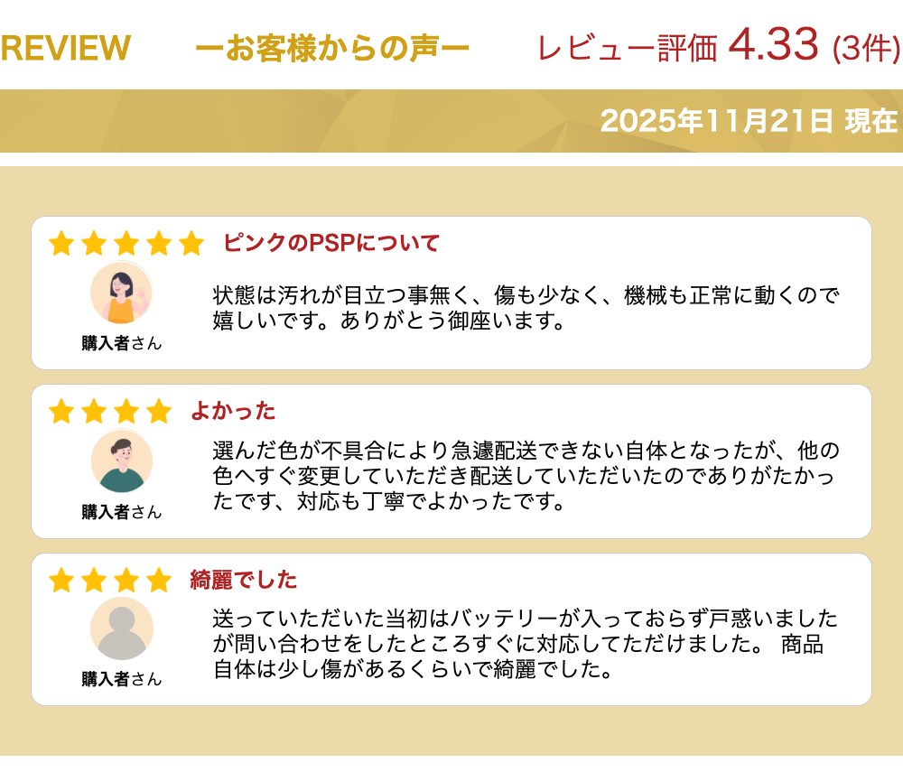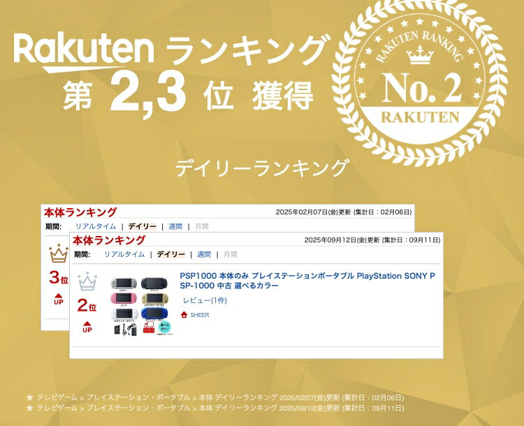 【セット内容】 ■本体×1 ■バッテリー×1 ■ACアダプター×1 ■メガネコード×1 ※メモリースティックは付属しません。 PSP初代モデル PSP-1000本体 選べるカラー! ■PSP-1000 本体※カラーをお選びください ●ブラック ●セラミック・ホワイト ●シルバー ●メタリック・ブルー ●ピンク ●シャンパン・ゴールド ●カラーランダム 【ショップ&商品レビューを投稿することでソフト3本プレゼントキャンペーン実施中!】 ※ソフトはランダムとなります ※レビュー投稿後に注文番号をショップへご連絡ください。 ※中古ゲームソフトとなります。パッケージ・取扱説明書など付属品を欠品する場合がございます。 ※当店にて動作確認を行っておりますが、万が一動作不良等があった場合は、保証期間内にお問い合わせください。商品代金を全額返金させていただきます。 ※商品画像はイメージです。特に中古商品には個体差があり、実際とは異なる場合があります。 関連商品【すぐ遊べるセット】純正充電器+新品互換バッテリー+プレゼントキャンペ...純正充電器+新品互換バッテリー +レビューキャンペーン PSP-300...純正充電器+新品互換バッテリー +メモリーカード+レビューキャンペーン...9,980円16,500円15,500円PSP-3001 PSP 北米版 本体 プレイステーション ポータブル...【訳あり】PS2 本体 純正コントローラー1個 SCPH-10000 ...★ソフトプレゼント★ハードケース付き スーパーファミコン本体 SFC...14,800円8,980円8,880円純正充電器+レビューキャンペーン【箱付き】DS Lite DSライト ...★ソフトプレゼント★PS2 本体 プレステ2 PlayStation2...ゲームボーイポケット 本体 任天堂 ニンテンドー ゲームボーイ ポケ...8,980円9,500円9,680円ゲームボーイカラー おまけソフト 本体のみ 選べるカラー レトロゲーム...★ソフトプレゼント★PS2 本体 ACアダプターSONY PlaySt...ソフトプレゼント★PS2 本体のみ 厚型 (SCPH-10000〜...9,880円10,980円6,980円【セット内容】・本体×1・バッテリー×1・ACアダプター×1・メガネコード×1※メモリースティックは付属しません。PSP-1000本体 選べるカラー! ■PSP-1000 本体※カラーをお選びください ●ブラック●セラミック・ホワイト●シルバー●メタリック・ブルー ●ピンク ●シャンパン・ゴールド ●カラーランダム【ショップ&商品レビューを投稿することでソフト3本プレゼントキャンペーン実施中!】 ※ソフトはランダムとなります ※レビュー投稿後に注文番号をショップへご連絡ください。 ※中古ゲームソフトとなります。パッケージ・取扱説明書など付属品を欠品する場合がございます。 ※当店にて動作確認を行っておりますが、万が一動作不良等があった場合は、保証期間内にお問い合わせください。商品代金を全額返金させていただきます。 ※商品画像はイメージです。特に中古商品には個体差があり、実際とは異なる場合があります。
